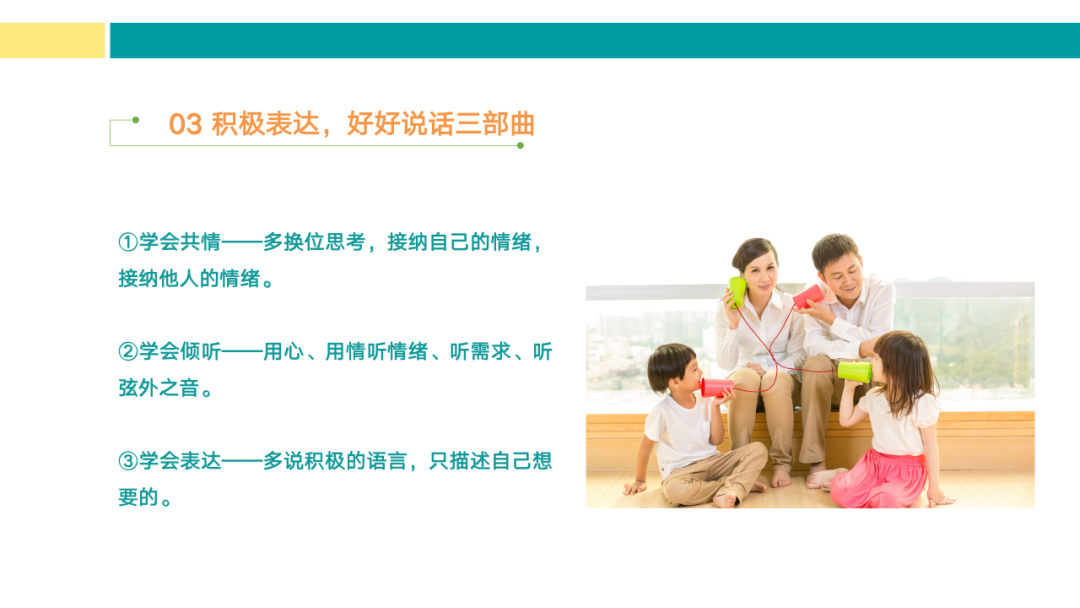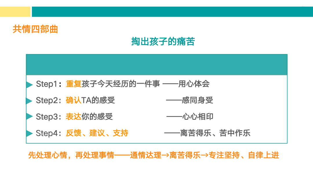 曹老师的课堂理论联系实际,非常有价值。听完之后,我收获颇丰。家长首先应该调整好自己的情绪,才能和孩子一起健康成长。我们应该努力学会“掏出”孩子的情绪,从孩子表面的行为反应,挖掘孩子埋在“根下”的情绪原因。允许孩子“情绪脑”的成长,然后在学习积极心理学的基础上,帮助孩子培养“理智脑”,而不是一味地让孩子理解家长们的情绪和愿望。这样才能让孩子在正确表达情绪的前提下,健康快乐地进步。