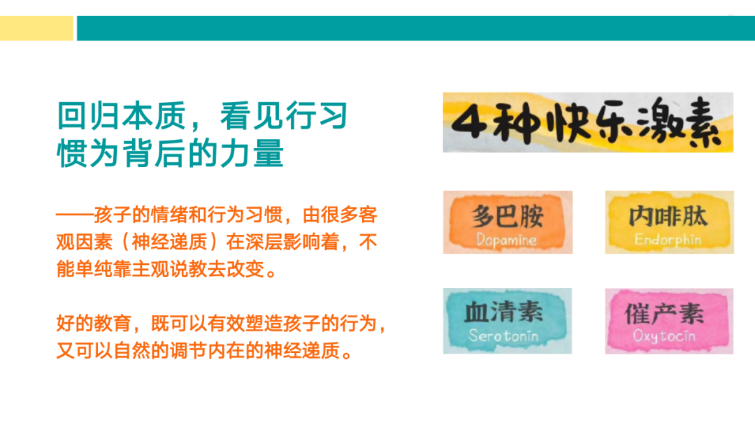 曹廷珲通过诸多事例,强调孩子的情绪和行为习惯,由很多客观因素(神经递质)在深层影响着,不能单纯靠主观说教去改变。好的教育,既可以有效塑造孩子的行为,又可以自然调节内在的神经。他还提出几种帮助孩子获得积极情绪的方式,家长要正确认识孩子情绪发展的阶段性,教会孩子合理表达情绪。家长在沟通中可采用共情四部曲:重复孩子经历的事并用心体会;确认孩子的感受做到感同身受;表达自己的感受与孩子心心相印;给予孩子及时的反馈、建议和支持,进而让孩子学会专注坚持、自律上进。