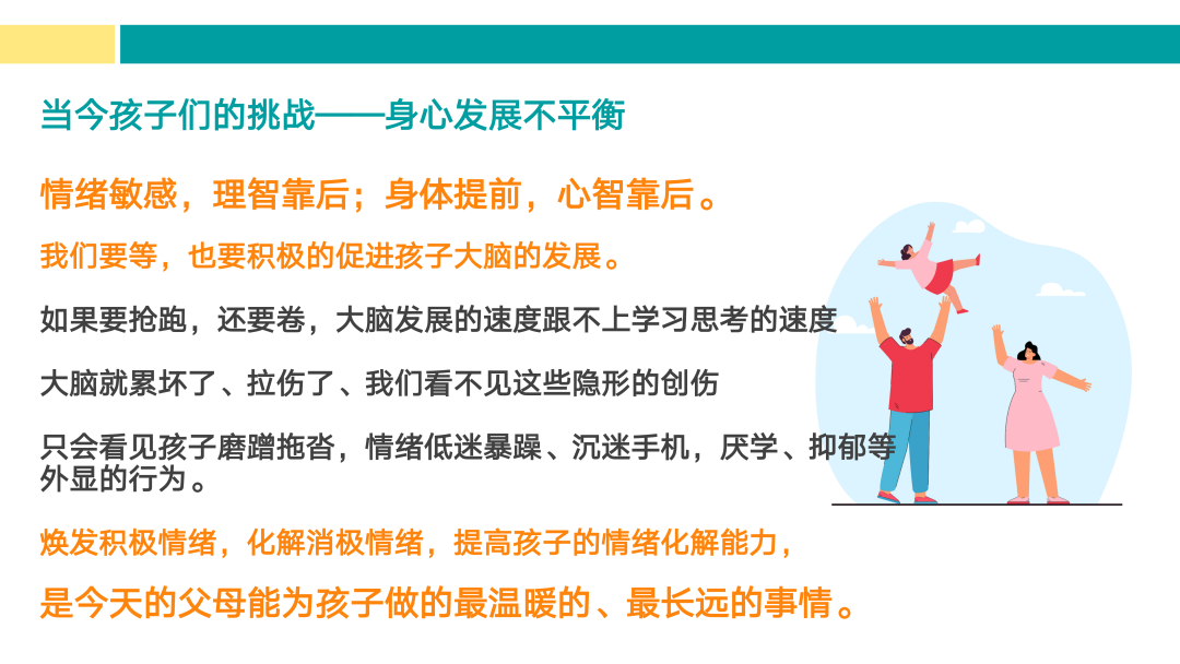 通过讲座,我深刻认识到要焕发积极情绪并关注孩子的情绪变化,引导他们积极面对生活中的挑战和困难。同时,我们家长也应该不断提升自身的情绪感知与调控能力,为孩子树立榜样。
