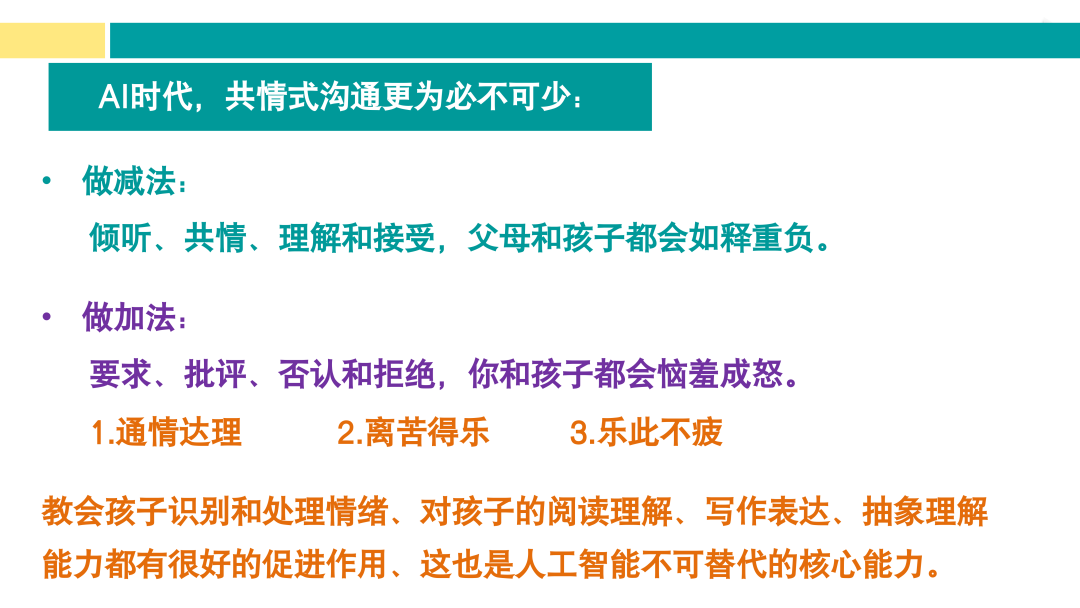 曹老师的分享,让我们清晰感知到高质量陪伴的具体方向。比如,积极陪伴孩子体验生活、多微笑、多运动、多进行视觉化的互动,乐观地看待问题。在遇到困难时陪伴孩子,在共情沟通中掏出孩子的痛苦,转苦为乐,让孩子在苦和乐中萌生幸福的种子,增强对各种事情的免疫力。