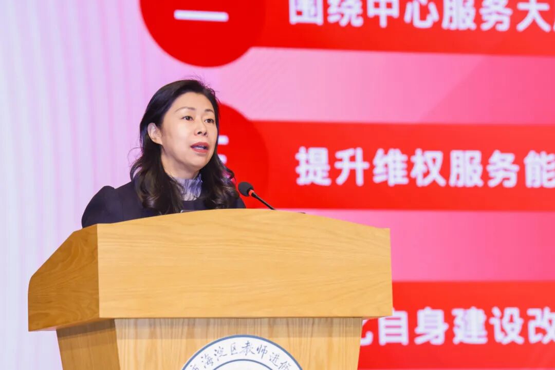 吴谨作海淀区教育工会2024年度工作报告。她从“加强思想政治引领,筑牢思想根基;围绕中心服务大局,汇聚奋进力量;提升维权服务能力,共享发展成果;深化自身建设改革,适应发展需求”四方面总结了2024年区教育工会工作基本情况;并就持续提高工会引领力、组织力、服务力、创新力所面临的新挑战进行了形势分析;最后介绍了2025年区教育工会工作基本思路:紧紧围绕新时代党的中心任务,更好发挥工会桥梁纽带作用,“明方向,锚定教育家精神坐标;强阵地,搭职工建功立业平台;重服务,建职工美好生活家园;促改革,提升与时俱进创新力”,切实提高海淀教职工的获得感、幸福感、安全感,团结起全区教职工自觉投身改革创新,在建设具有全球影响力的重要教育中心中不断展现海淀教育工会作为。