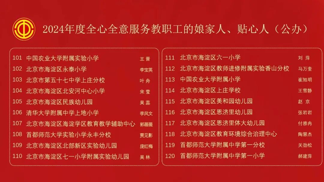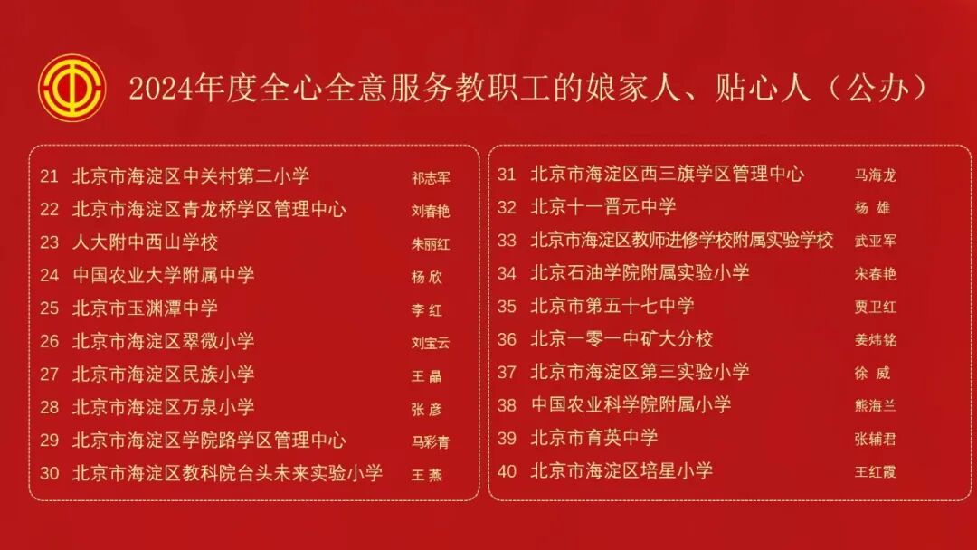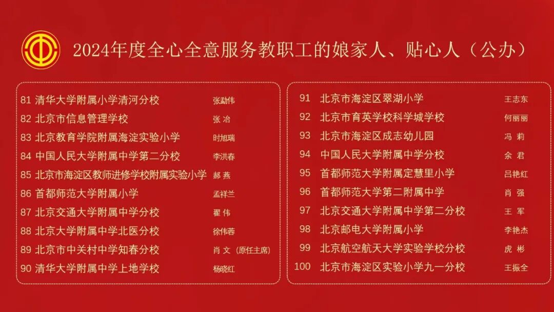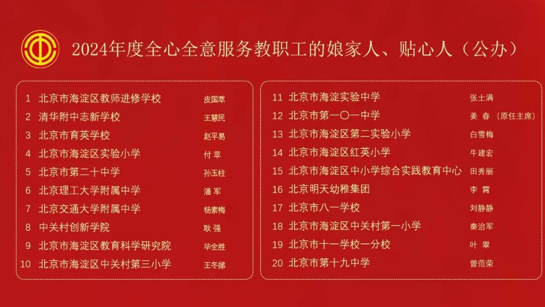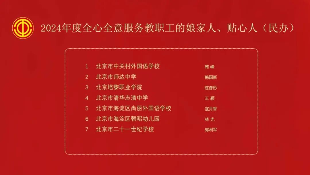 海淀区总工会副主席王春生为“2024年度全心全意服务教职工的娘家人、贴心人”颁奖。