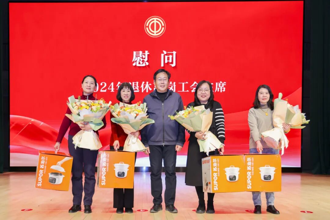 慰问退休离岗的工会主席是近几年海淀区教育工会一直以来的工作传统。2024年区教育系统共有7位工会主席退休,其中4位来到了活动现场。教委机关原工会主席姚军、中关村中学知春分校原工会主席肖文、四王府小学原工会主席郭小云、青龙桥青少年活动中心原工会负责人桂安琼走上舞台,区委教工委原副书记、教育督导室原主任乔键为她们送上慰问品。退休不是结束,而是新生活的起点,愿大家退休生活宁静惬意、舒心开怀。