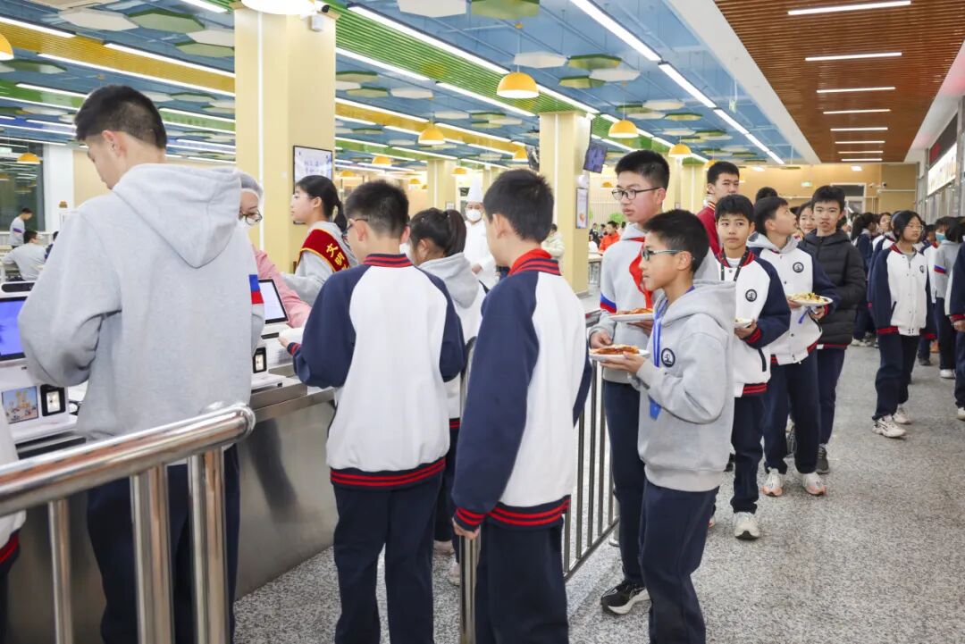 初一2班的魏子航同学兴奋地分享道,“我今天吃的东坡锦绣肉,红亮亮的肉块加上小油菜和鹌鹑蛋,色香味俱全,真的很好吃。而且我发现,食堂不仅变得更明亮了,还新增了电子显示屏,菜品价格和营养信息都一目了然!”