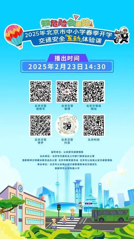 新学期开学,做好春季开学交通安全宣传教育、增强未成年人交通安全意识至关重要。2月23日下午,由公安部交通管理局指导,市交安联办、市公安交管局、首都精神文明办、市教委共同主办,市公安交管局海淀交通支队、首都师范大学附属小学承办的“知危险 会避险”2025年北京市中小学春季开学交通安全互动体验课和全市中小学生见面啦。