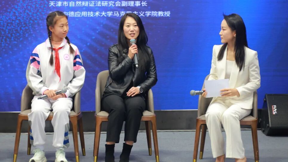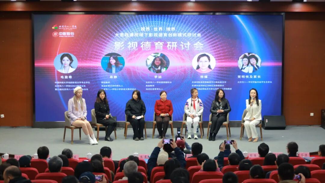 影视教育沙龙环节,中国教育电视台首席记者亢晓倩,影视教育专家、天津市影视思政教育中心常务副主任邢媛,八一学校副校长李喆,与师生代表、语文教研组长易静,初中预备年级学生党明悦及家长,学校毕业生、中国传媒大学学生毛盈希,共同围绕学校影视教育的顶层设计、课程实施以及学生家长的真实感受展开深入探讨。