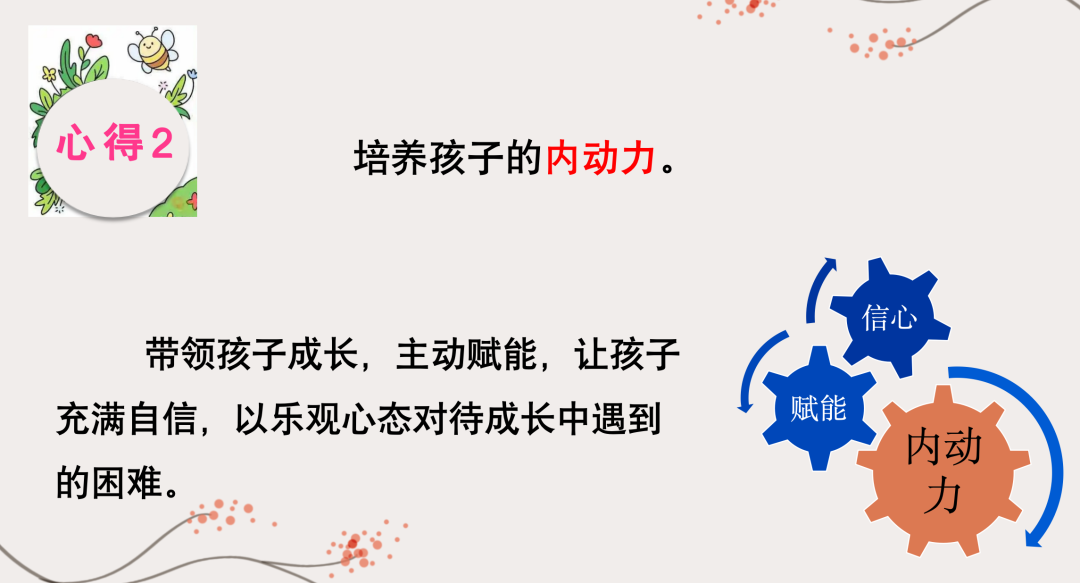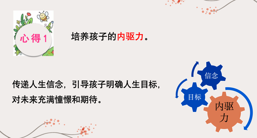 学习家庭教育大讲堂课程后,我深刻认识到,培养孩子的内驱力需要多方面的努力。首先,要呵护孩子的兴趣,通过多元化的活动让他们发现学习的乐趣;其次,善用“榜样磁场”,借助同龄榜样和师者风范激发孩子的进取心。同时,我也非常认同“学科自信分层培养”的理念,比如英语可以通过情景对话激发兴趣,数学则可利用错题银行帮助孩子重塑认知,让他们在成就感中建立自信。此外,“时间赋能”策略也让我深受启发,用主题式探究替代碎片化娱乐,让孩子的每一段时光都充满成长的意义。作为家长,我们要做好“托举者”,与学校共同构建“内驱力生态”,为孩子提供支持与引导,静待他们的成长与绽放。