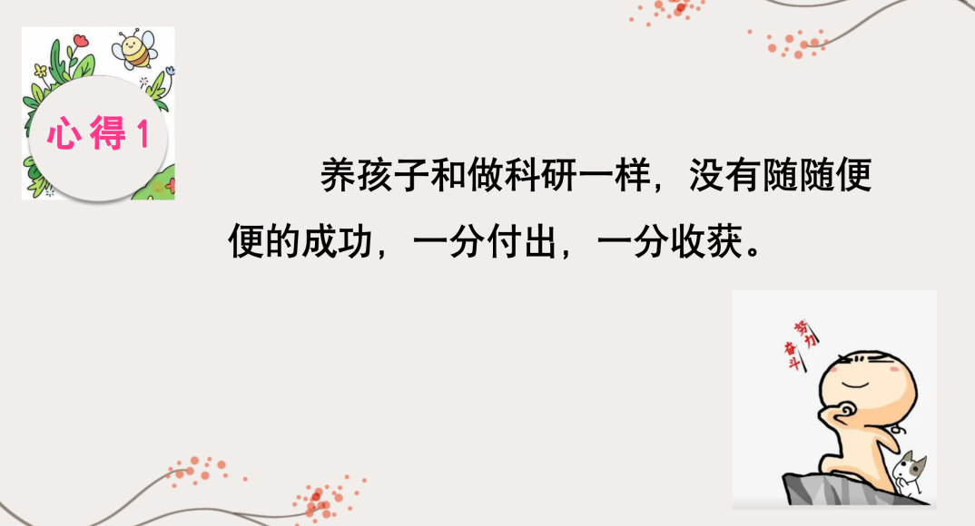 作为一名孩子刚刚步入幼儿园的“新手家长”,这次近两个小时的家长课堂学习让我深受启发。我感触最深的是“养孩子和做科研一样,没有随随便便的成功,一份付出,一分收获”。和王淑芳老师一样,我也是一名国防科研单位的工作人员,同样经历过科研项目攻坚的困难与无助,如果把培养孩子看成一个国家十几年、几十年才能获得成功的科研项目,那么家长在心态上就能够更好地面对孩子成长过程中出现的很多不确定和不完美,还能一起陪孩子自信而坚定地走下去。在我看来,榜样的力量很重要,作为家长,我们要以身作则、以身示范,助力孩子们成为更好的人。