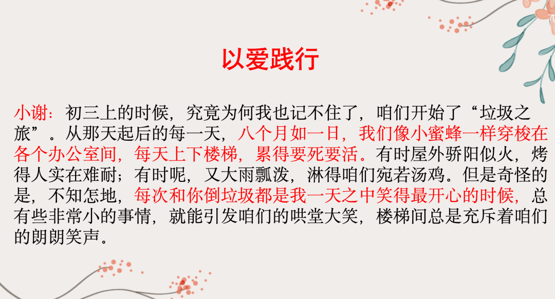 王淑芳老师的讲座让我深受触动,也让我收获了四方面的启发:一坚定信心,不再因孩子暂时落后焦虑,相信学校、老师和自己的付出,保持教育定力;二立大志育德,从日常小事抓起,带孩子参与公益,把家国情怀融入生活细节,培养孩子的“大我”格局;三尽教育之责,把育儿当作事业经营,深度参与到孩子的成长中去,助力其全面发展;四智慧育儿,遇到问题时先冷静,与孩子共同寻找解决方案,把矛盾转化为成长契机,避免情绪对抗。