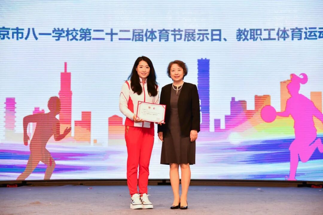 仪式上,王伟丽为世界冠军罗雪娟颁发北京市八一学校课程指导专家聘书。北京市教委体卫艺处副处长张志华为在学校中长跑挑战赛中获得优胜奖的学生代表颁奖;海淀区体育局局长白雪罡、海淀区教委副主任赵霞为在学校篮球、足球班级联赛中获得冠军的班级学生代表颁发奖杯;学校领导还颁发了八一学校体育工作优秀管理奖,鼓励他们再接再厉,为推动校园体育事业发展贡献更多力量。