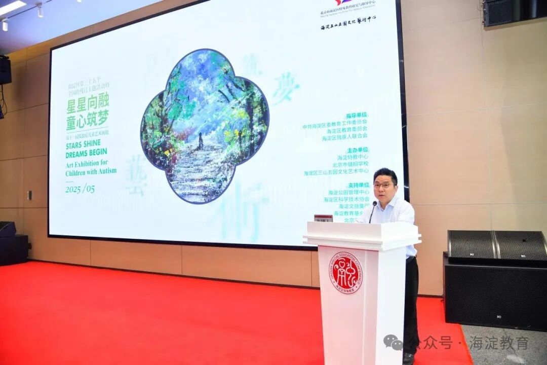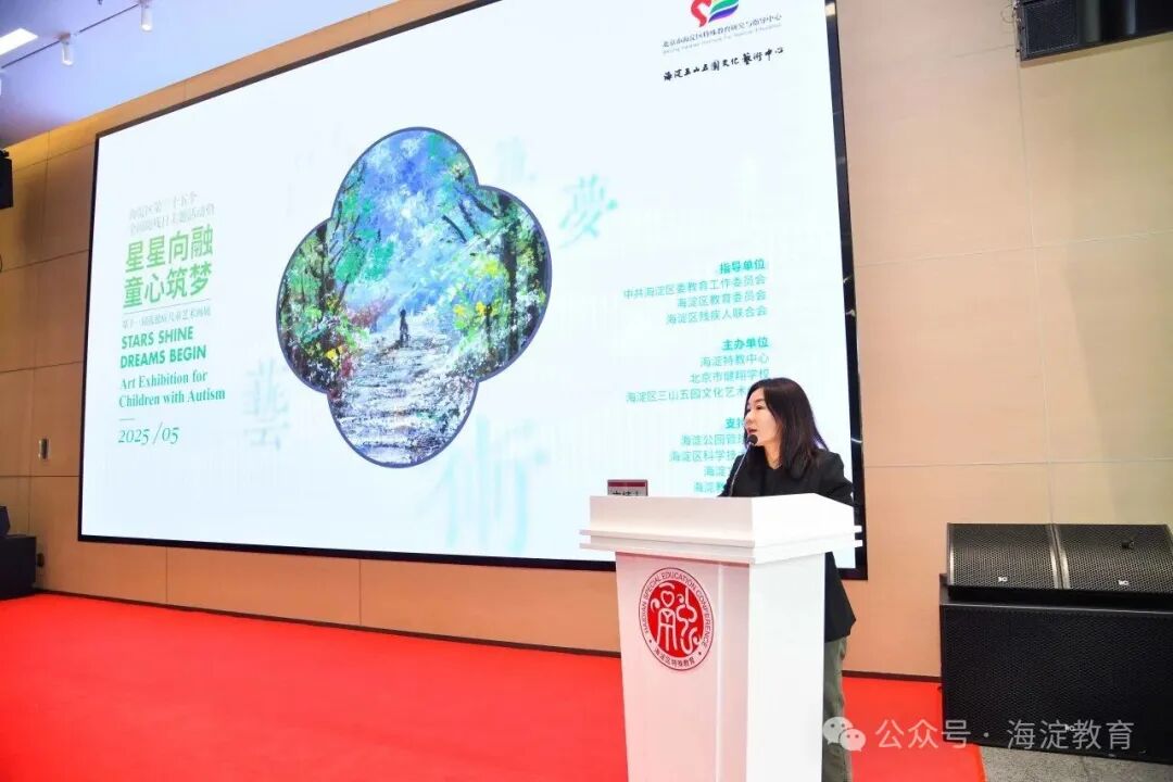 北京市特殊教育研究指导中心主任孙颖在讲话中指出,艺术是孤独症儿童表达自我的重要途径,也是帮助他们融入社会的重要手段。希望海淀区能够继续用教育的力量点亮希望,用科技的温度驱散孤独,用协同的格局书写大爱,助力每一名学生茁壮成长。