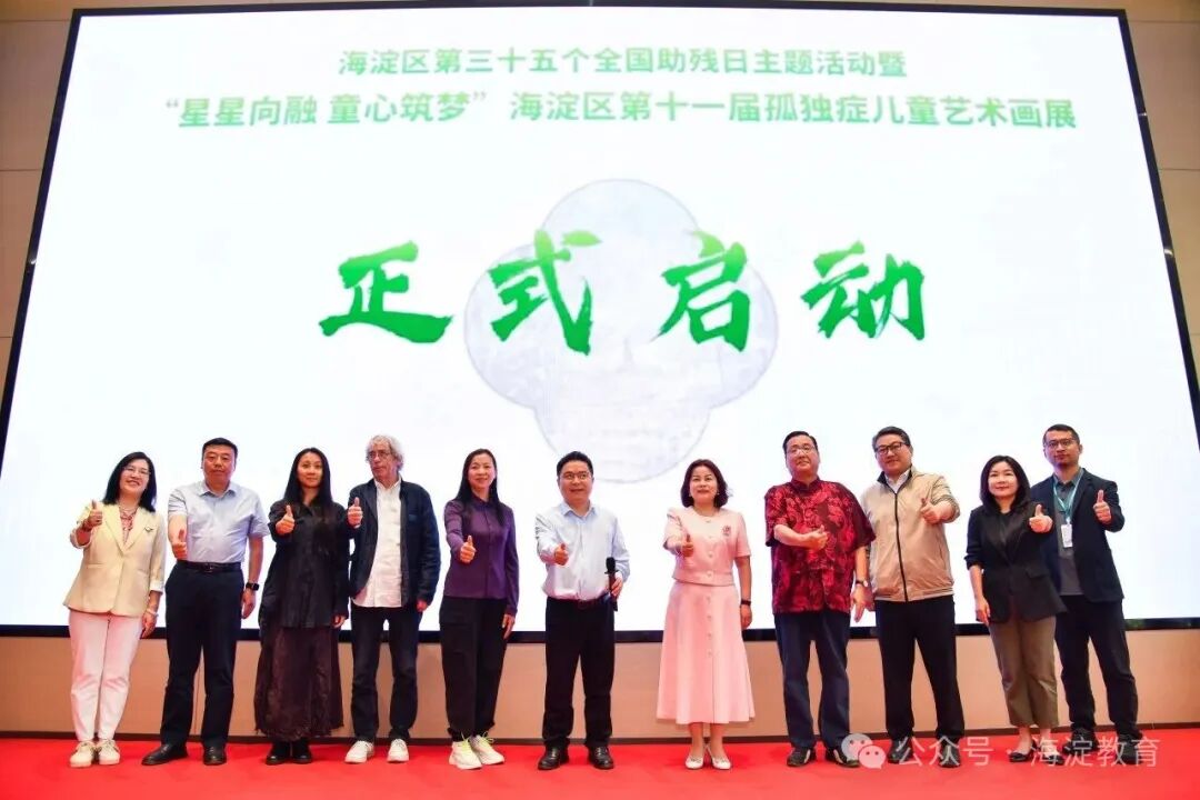 活动现场,领导及嘉宾代表共同将手掌按向启动台,一株象征着生命力的树苗破土而出,渐次舒展枝叶,2025年海淀区第三十五次全国助残日主题活动暨第十一届“星星向融·童心筑梦”孤独症儿童艺术画展正式启动。