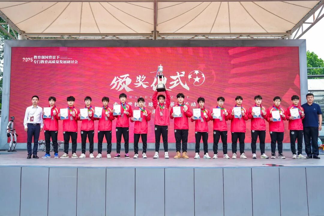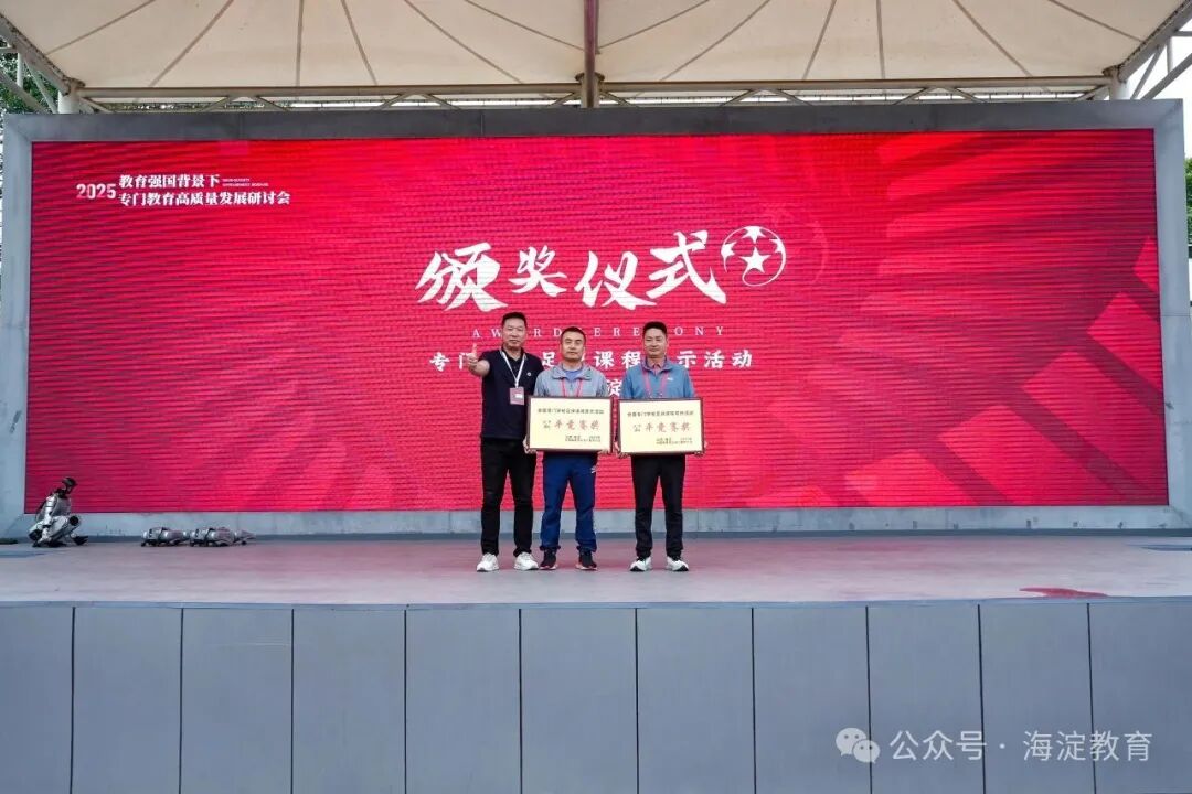 研讨活动中,还为参加足球课程展示活动的代表队颁奖。据悉,5月18日—21日,8支来自全国专门学校的学生参加了全国专门学校足球课程展示活动暨全国专门学校足球邀请赛。在为期4天20场的激烈比赛中,不仅展现了同学们对足球的热爱和友谊的珍视,也展示了足球运动的魅力与足球教育理念在专门教育中的实践效果。活动共评选出公平竞赛奖、金手套奖、金靴奖、金球奖、优秀教练和金牌教练等荣誉称号。海淀区教委体健科科长王宏斌主持颁奖仪式。