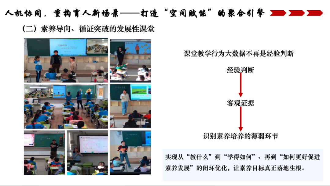 聚焦AI时代“学校·教师·学生共生的教育新图景”,我们一定要说的是“循证·智研”。过去的一个学年里,在集团的加持、学校的引领、北师大团队的帮助下,学校团队教师勇敢实践,实现了从提炼数据到读懂数据,从读懂数据到使用数据驱动教学方式变革的认知觉醒与精准赋能。对于人工智能辅助下的“循证·智研”,大家有了更加理性地认识。客观记录下的数据,不是解释教育现象、助力教育高质量发展的唯一证据。育人的事业,需要人文的关怀、经验的温度,“循证·智研”的理性要共同作用,才能使学生的素养落地,才能在与时代的共生中和孩子们一起,向善、向美、向未来。