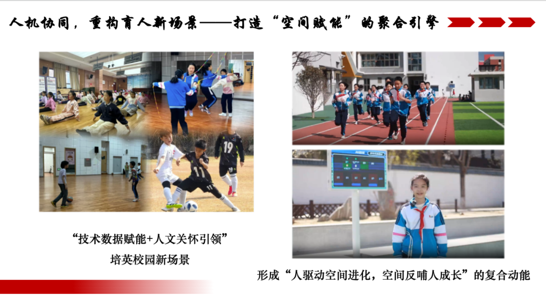 培英未来实验小学校长杨莹以《以人为本“智”领航 三擎驱动“乐”成长》为题,从“聚焦问题,培训引领;人机协同,重构育人新场景;主动寻变,项目赋能促提升”三个方面,详细阐述了学校以智能技术为支撑,以循证研究为方法,驱动育人模式、教学方式和教师发展的探索实践。学校通过人机协同,打造智慧操场、沉浸朗读等育人新场景,聚合“空间赋能”引擎,让教师更专注于“育人”核心使命,让每个学生获得适配的学习方案,实现“因材施教”的教育理想。