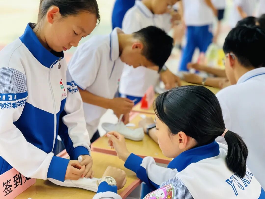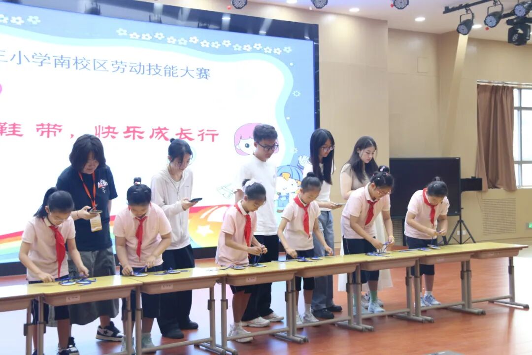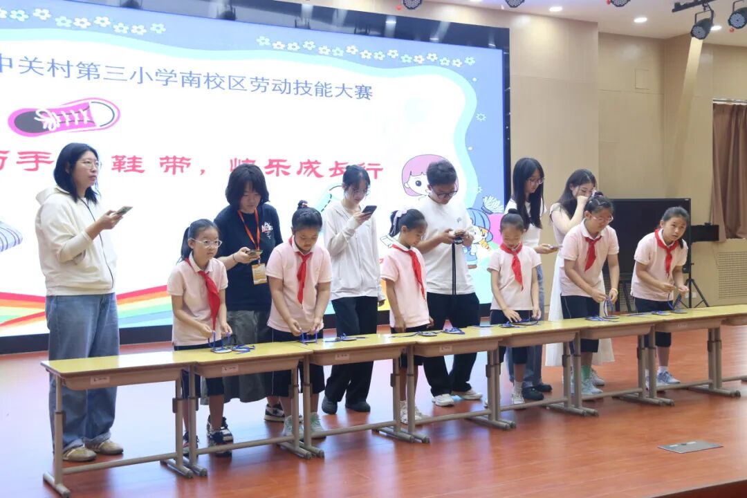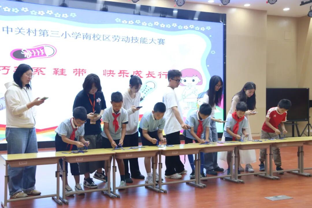 中关村第三小学南校区举办了一场别开生面的三年级劳动技能大赛——系鞋带。比赛旨在培养学生的自理能力、生活技能和动手实践能力,三年级各班通过班级系鞋带大赛,评选出男女生各一名优胜者,推荐到学校参加校级比赛。比赛过程中,选手们全神贯注,展现出高超的系鞋带技巧和专注的态度,本次比赛共产生一等奖12名,二等奖24名。这是一次生动的劳动教育实践活动,不仅锻炼了学生的自理能力,还激发了他们的劳动热情。