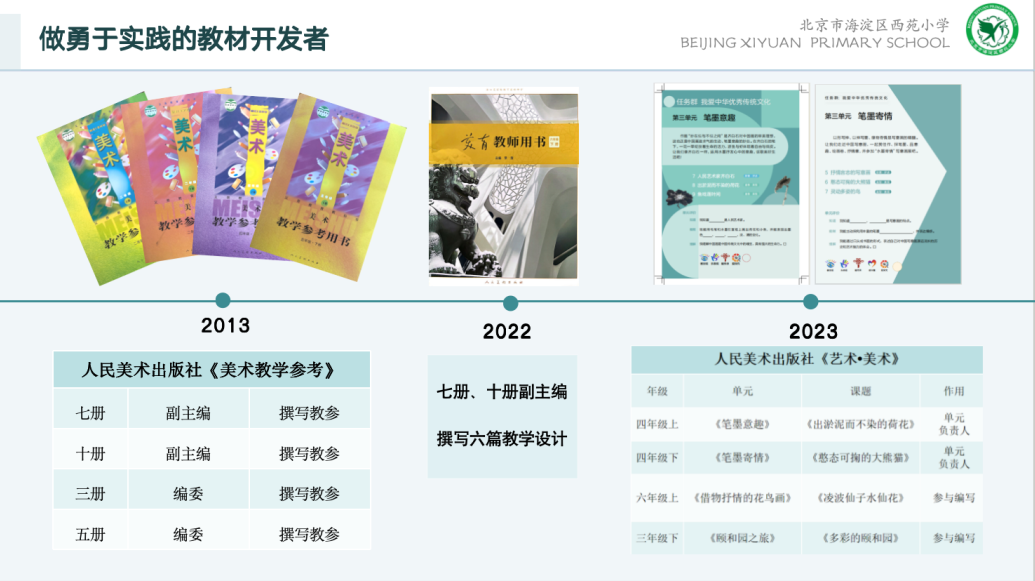 海淀区西苑小学美术教师。北京市市级美术学科带头人、高级教师;海淀区美术学科督学、海淀区名师工作站导师、海淀区美术兼职教研员、海淀区“四有”教师;全国版《美术教师参考用书》副主编,人美版《美育》教师用书编委;中国教育电视台《同上一堂课》小学美术指导教师并参与课程录制。曾获全国中小学美术教师基本功大赛一等奖、全国美术教育论文一等奖等多个奖项,教学研究课被全国继教网收录,论文在多个全国级核心刊物上发表。