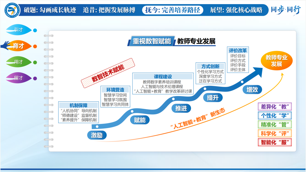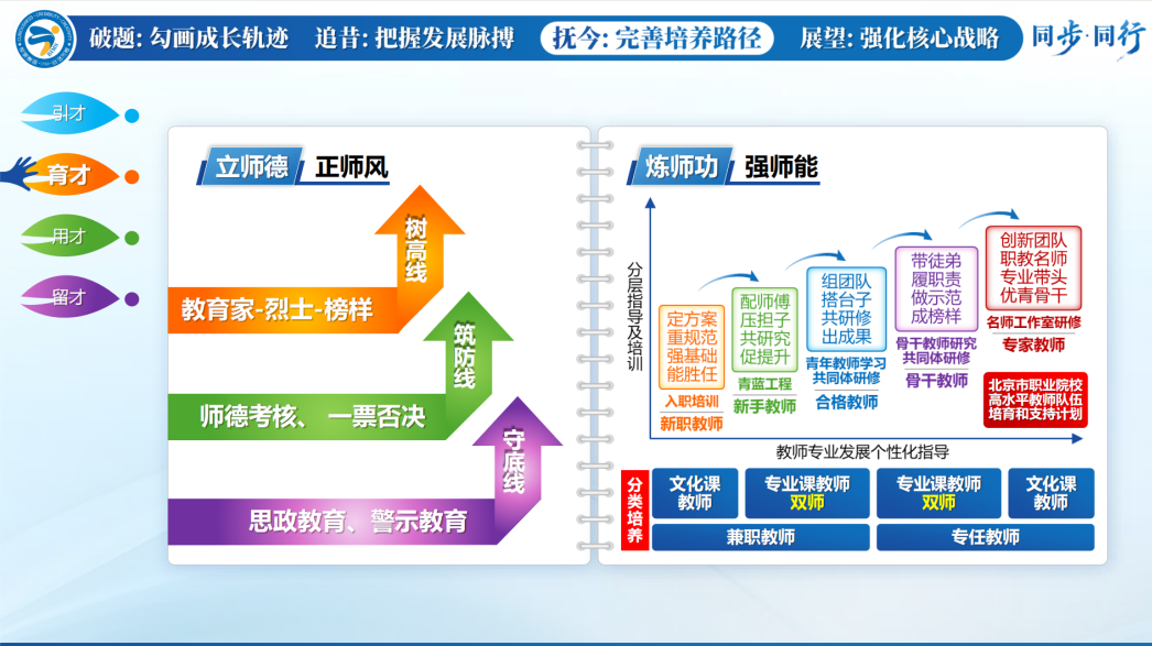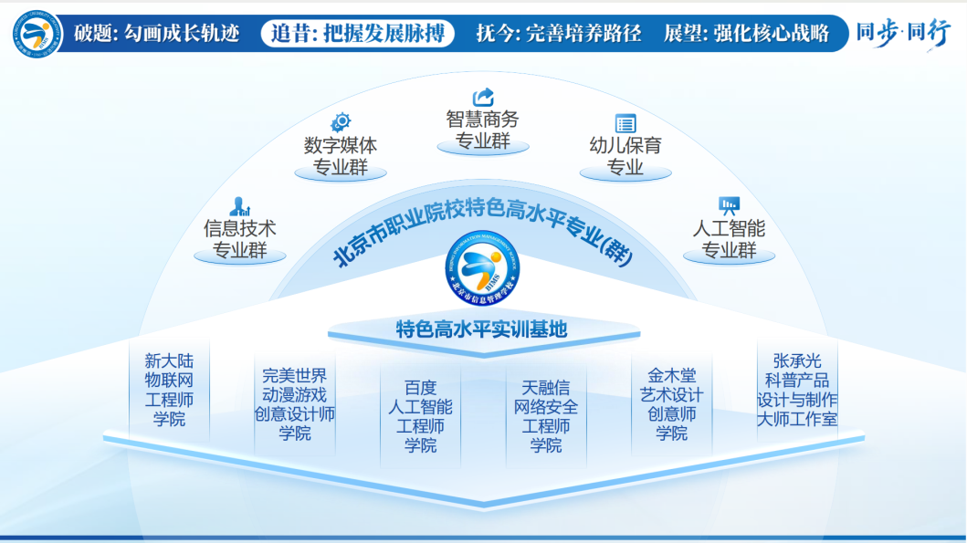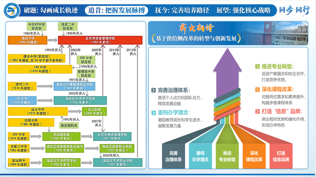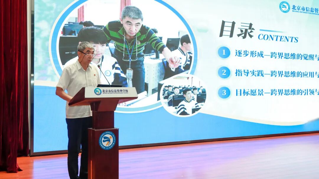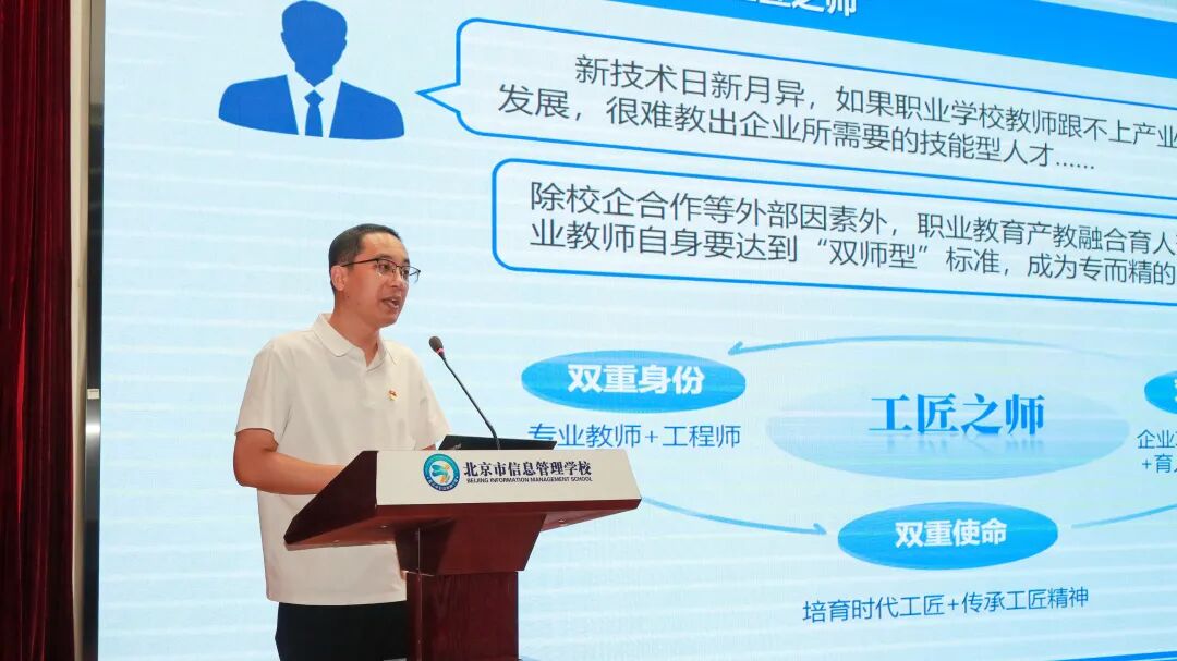北京市信息管理学校党委副书记、校长董随东围绕“破题”“追昔”“抚今”“展望”四个方面,系统梳理了信息管理学校薪火相传的发展脉络,分享了学校通过优化结构提升质量的名师培养路径,再次诠释了“与时代同步 与卓越同行”的学校内涵发展精神,这种一流双师拔节培养的传帮带生态,给职业教育发展提供了持续发展的内生动力。