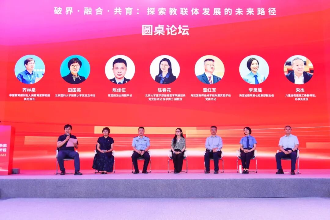 会议还特别设置了的圆桌论坛环节。来自北医附小、花园路派出所、北大医学部基础医学院解剖系、海淀区教师进修学校附属实验学校、海淀检察院第七检察部、八里庄街道、中国教育报刊社人民教育家研究院的7位领导、专家,围绕“破界·融合·共育”的主题,分享了分别以北医附小、海淀区教师进修学校附属实验学校为圆心的家校社协同育人故事,并共同探讨了如何让学校、家庭、社会以及相关专业力量在“教联体”框架下更有效联动、需要破解哪些关键问题等核心议题。