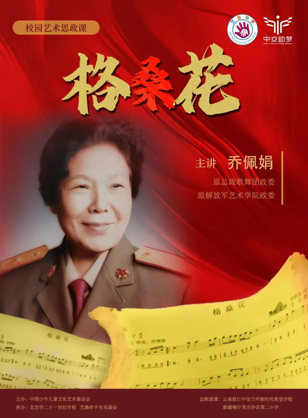 原总政歌舞团政委、原解放军艺术学院政委乔佩娟将军,也是中国歌剧《小二黑结婚》“小芹”的首演者,以93岁高龄亲自为孩子们授课。乔老师以敏捷的思路,对孩子们回忆自身在西藏的艰苦经历。《格桑花》这首歌隐喻伟大的边防战士,歌颂他们吃苦耐劳的意志品质以及对祖国最深沉而厚重的爱。作为老一辈无产阶级革命家,乔老师说:“人的生命是有限的,人生的旅途也是短暂的,而党的事业是伟大的,需要一代又一代的人矢志不渝地去奋斗”,她由衷地期望新时代的青少年不怕困难、勇挑重担,像“格桑花”一般坚强不屈、爱国奉献。
