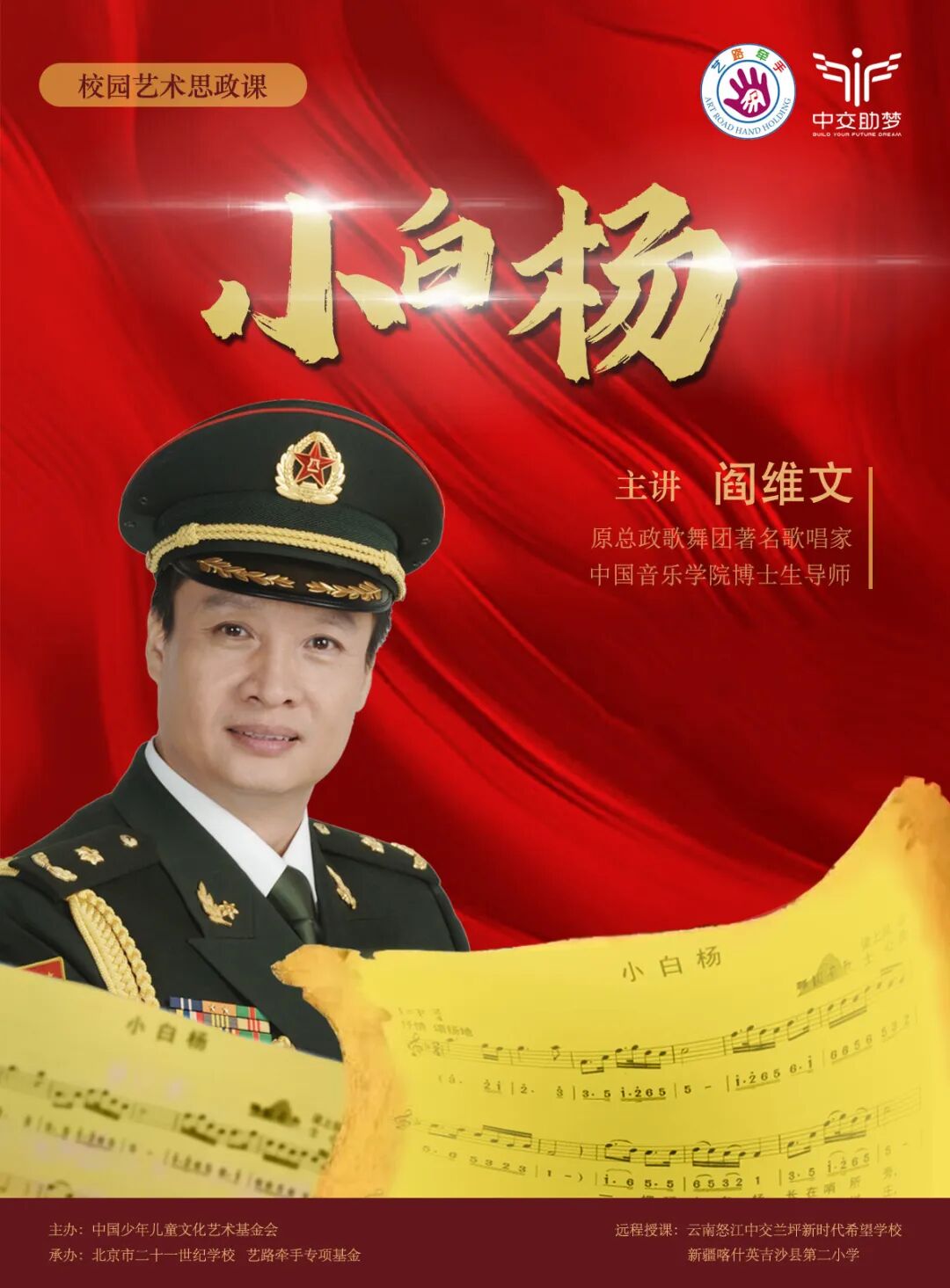 原总政歌舞团著名歌唱家、中国音乐学院博士生导师阎维文老师,在代表作《小白杨》中歌颂驻守边疆的战士像一棵棵挺拔的小白杨,为伟大的祖国遮风挡雨。他们伟岸挺拔的身姿闪耀在西藏高原、舟山群岛、新疆戈壁、内蒙古草原、西沙群岛、南沙群岛、1985年老山前线、1998年抗洪抢险、2003年抗击非典、2008年汶川地震等重要时刻,给人们带来安定和希望。阎维文老师用故事和歌声,为学生带来心灵启迪。