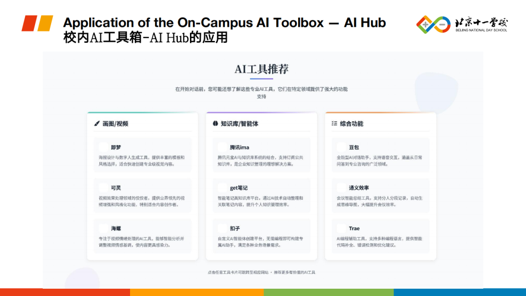 这一转变的发生,成立刚刚一年多的AI星项目组功不可没。该项目组目前已基本覆盖全学科,带动教师们寻找适用的AI教育工具,自主探索落地的可能性,形成应用案例再进行体验式推广。项目组还研发了集画图、视频、知识库、综合功能等为一体的校内AI工具箱(AI Hub)教学辅助工具,便于教师们快捷调用AI工具。