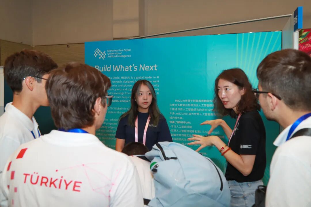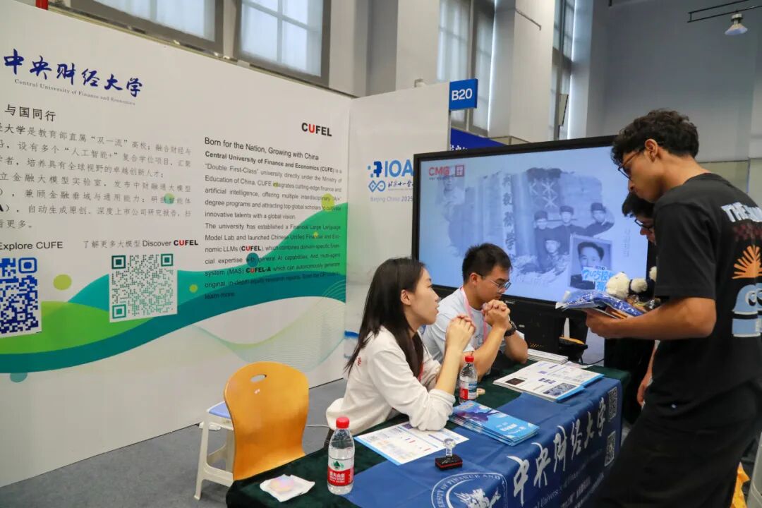 在高校展区,清华大学的AI Cosmos平台、北京大学的AI科研成果、北邮的机械狗大模型交互系统、深圳大学的智能养殖项目,以及中国科学院大学等多所高校集中展示了中学生可接触的前沿AI科研生态。来自阿联酋默罕默德·本·扎耶德人工智能大学、上海交通大学、浙江大学等高校的国际招生宣传,进一步打开了中学生对AI学习路径的全球视野。
