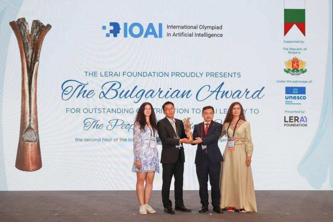 颁奖后,IOAI国际科学委员会主席Ali Sharif Zarchi与国际组委会主席 Elena Marinova总结本届活动,高度赞誉北京市十一学校的精心筹备与卓越贡献,并向主办方代表田俊校长和毛勇博士颁发“IOAI杰出贡献奖”,表彰其推动全球青少年AI教育交流的关键作用。