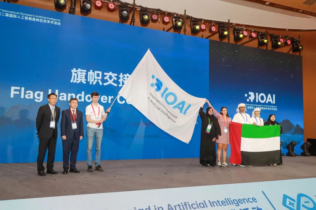 闭幕式尾声,象征开放与合作的IOAI会旗正式移交下一届主办方阿联酋代表,寓意使命延续与共同期许。