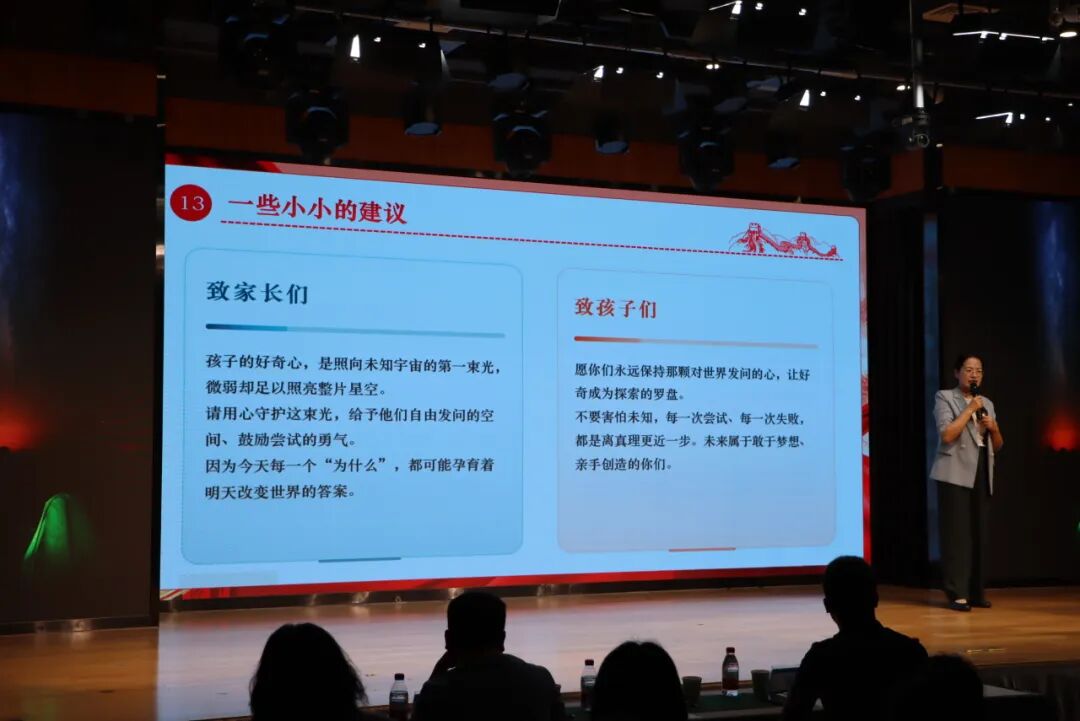 在教育经验分享环节,顾老师的家庭素养教育方式给我留下了深刻印象。她带着孩子研究科普书籍、观看纪录片、前往科技馆并进行科学实践,通过这些方式,激发孩子对科学的兴趣和热爱。这种亲身实践、寓教于乐的教育方法,不仅让孩子在轻松愉快的氛围中学习科学知识,更重要的是点燃了他们科技报国的火种。