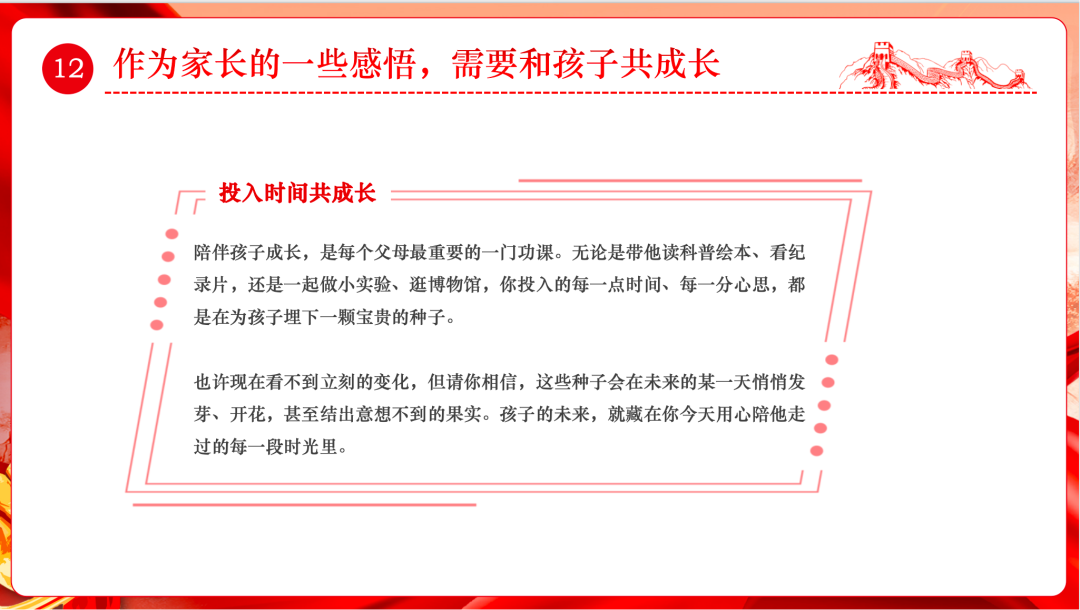 顾老师现场分享经验:为带女儿去博物馆,她甚至提前一天到馆学习,挑出孩子可能感兴趣的藏品,提前渗透知识,激发孩子的好奇心与积极性。这让我深刻体会到:只要家长用心浇灌,孩子定能茁壮成长。孩子的未来就藏在家长用心陪伴她走过的每一段时光里。
