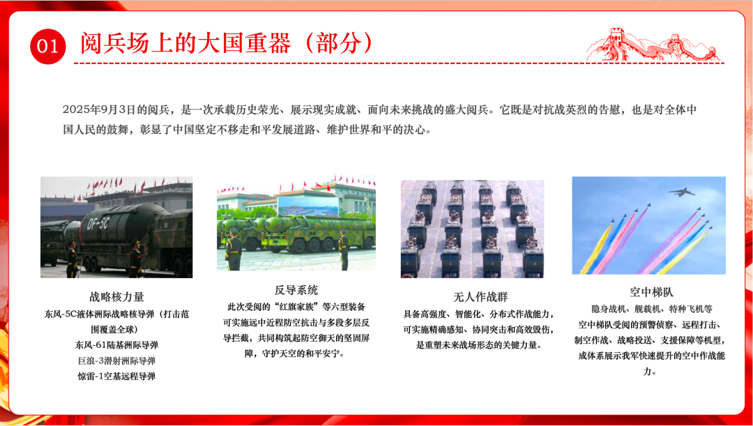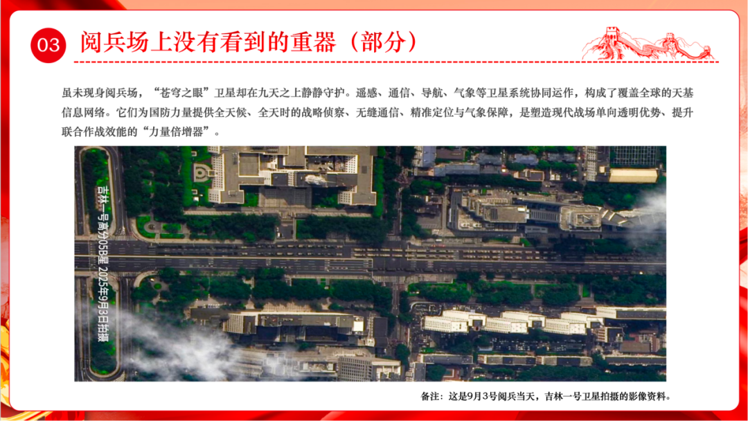 以9月3日阅兵仪式上的战略核力量、反导系统、无人作战群、空中梯队以及导弹和火箭为切入点,顾璐琰向大家引入了“苍穹之眼”卫星,指出遥感、通信、导航、气象等卫星系统的协同运作为国防力量提供了保障。中国空间站、载人登月计划、火星探测这系列探索,正是中国力量的具象化体现。