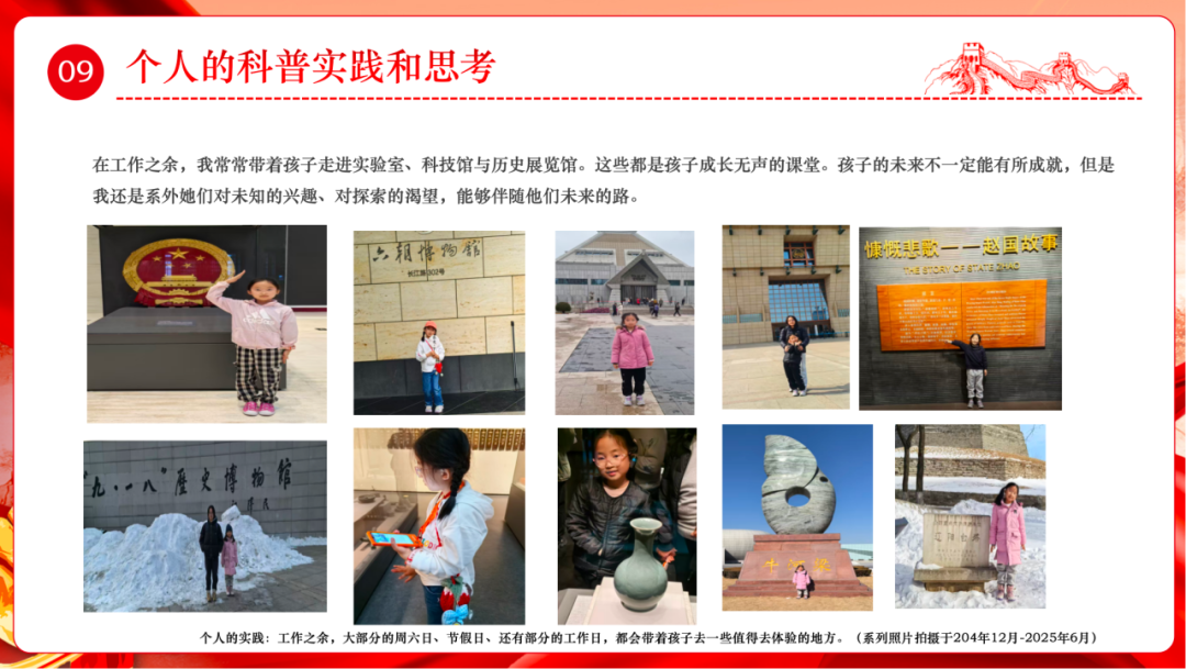 通过学习,我决定在今后的孩子教育方面,不能只学书本上的知识,更要多带着孩子走进实验室、科技馆与历史展览馆等场所。这些都是孩子成长无声的课堂,可以激发她们对未知的兴趣、对探索的渴望。在日常生活中,我也将以科普阅读为基础,为孩子挑选优质读物,构建知识框架、激发想象,以纪录片为延伸,通过震撼的视听语言,将书本概念转化为生动真实的科学图景,以科普馆体验为核心,带领孩子参与小实验、野外观察或模型制作,引导他们从“被动接收”转向“主动探索”。