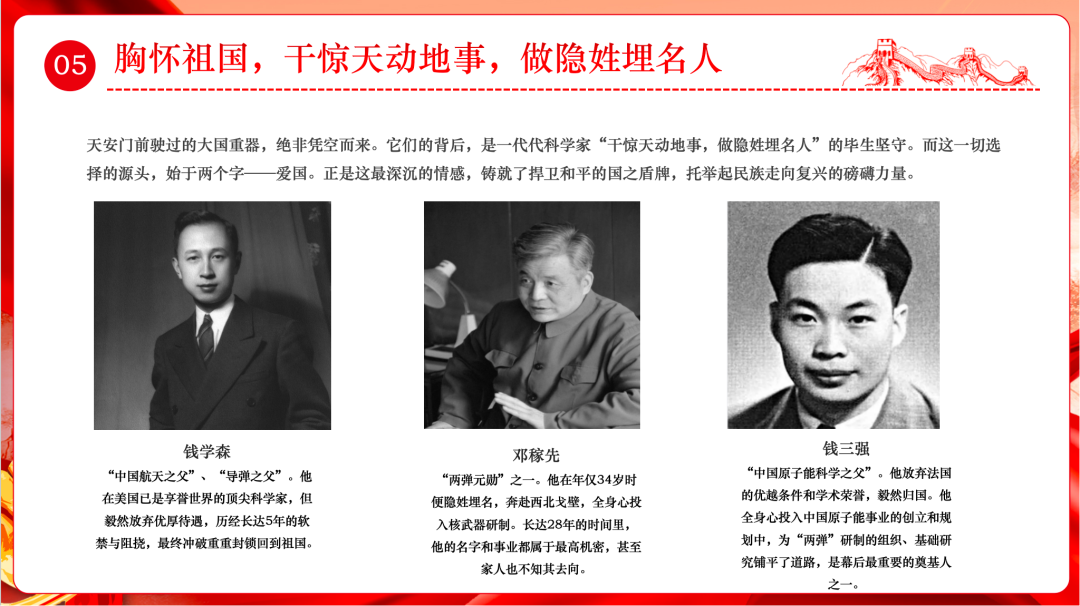 谈起天安门前驶过的大国重器,顾璐琰谈到,它们的背后,是一代代像钱学森、邓稼先等科学家“干惊天动地事,做隐姓埋名人”的毕生坚守。从“东方红一号”奏响寰宇,到如今深空探测屹立世界前沿,无数科学家们一次次完成从0到1的原始突破。他们始终将爱国情感化为探索和研发动力,为千万人民铸就了捍卫和平的国之盾牌,托举起民族走向复兴的磅礴力量。