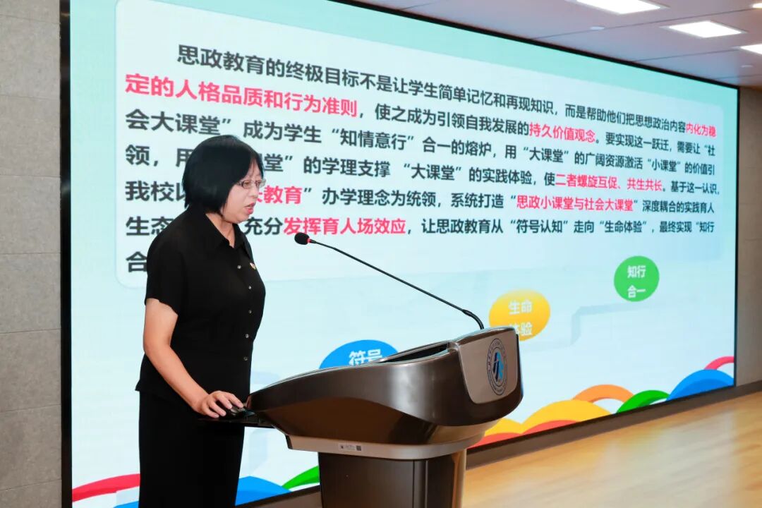 北京市第十九中学党委书记高新桥以中学法治教育为例从“通过学科融通”“学段贯通”“校内外打通”三个方面,详细介绍了十九中通过多学科融合推进课程思政的中学行动。她表示,学校构建了聚焦法治意识培养的教学实施体系、科研引领体系和实践育人体系,构建了多学科融合推进课程思政发展的实践范式,形成了思政课程与课程思政同向同行、协同育人的新格局。学校还将从学科体系、教学体系、实践体系、方法体系、管理体系、环境体系等多维度入手,全方位推进大中小学思政教育一体化建设。