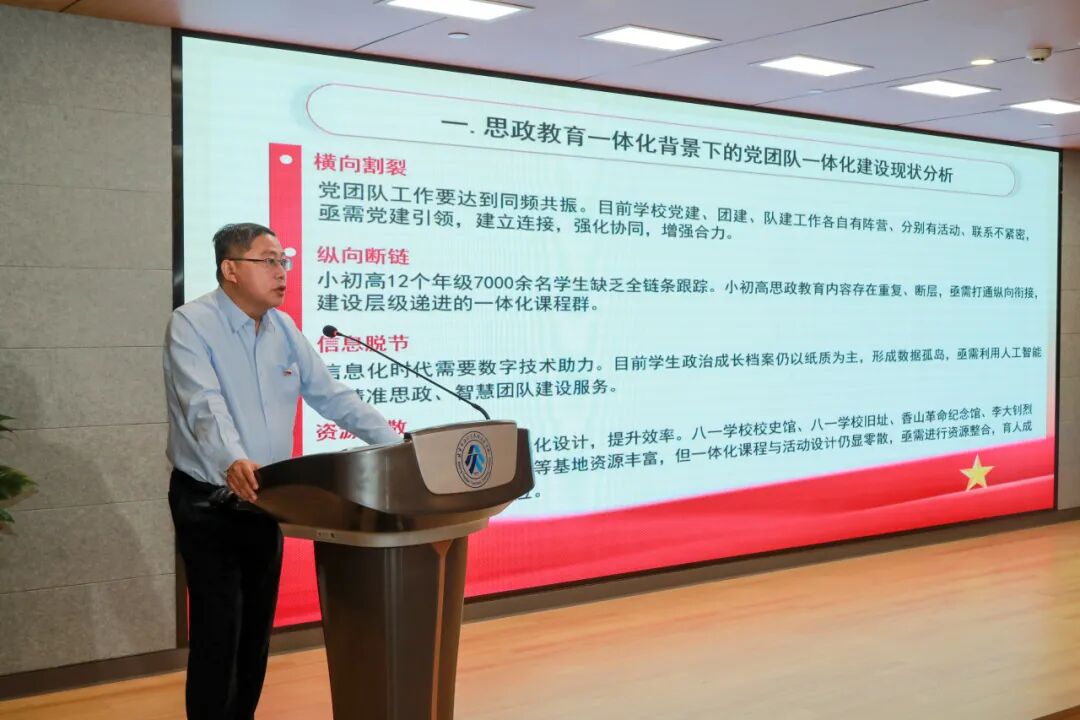 北京市八一学校党委书记沈军作题为“筑牢党团队一体化育人链条,打造学校思政育人品牌”的交流发言,他表示,学校构建了党团队一体化育人链条,学校党委领导、全团带队,充分发挥共青团、少先队在学校育人体系中的独特作用,传承红色基因,重点打造了特色思政育人品牌——融合“十二人才基因”的十二年贯通课程、党团队一体化“追光”系列课程等原创内容。学校通过语文、历史、科技、艺术学科的交叉设计,开发了“红诗里的党史”“红色基因里的科学密码”等STEAM课程,将党团队育人全链条串联起来,实现“过程可测、结果可用、激励即时、成长可见”。