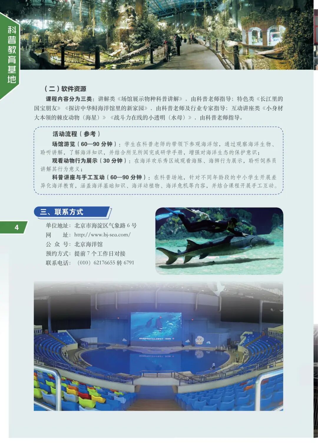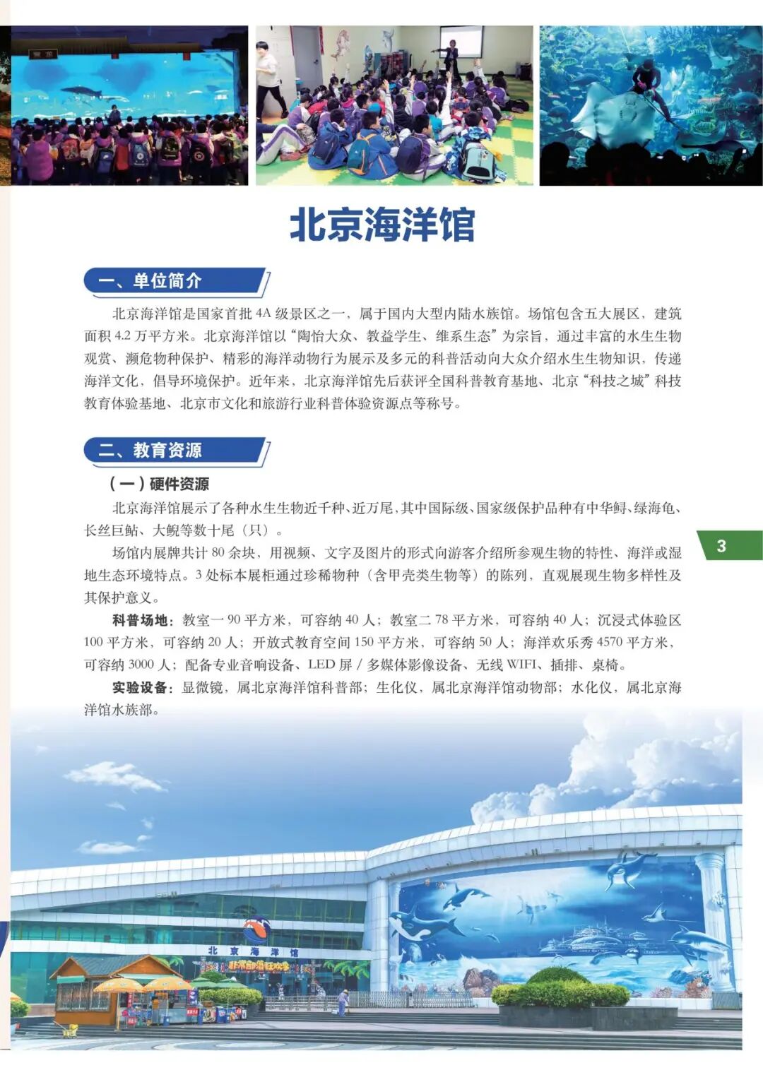 手册突破传统名录罗列,兼具资源导览与教学指南功能。如北京海洋馆不仅展示近万尾珍稀生物资源,更明确标注其150平方米开放式教育空间支撑50人实践课,100平方米沉浸式体验区适配探究学习,甚至细化到显微镜、水质检测仪等教学设备配置。