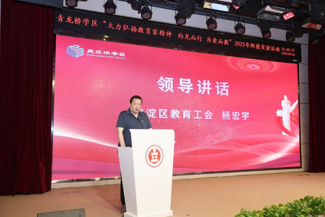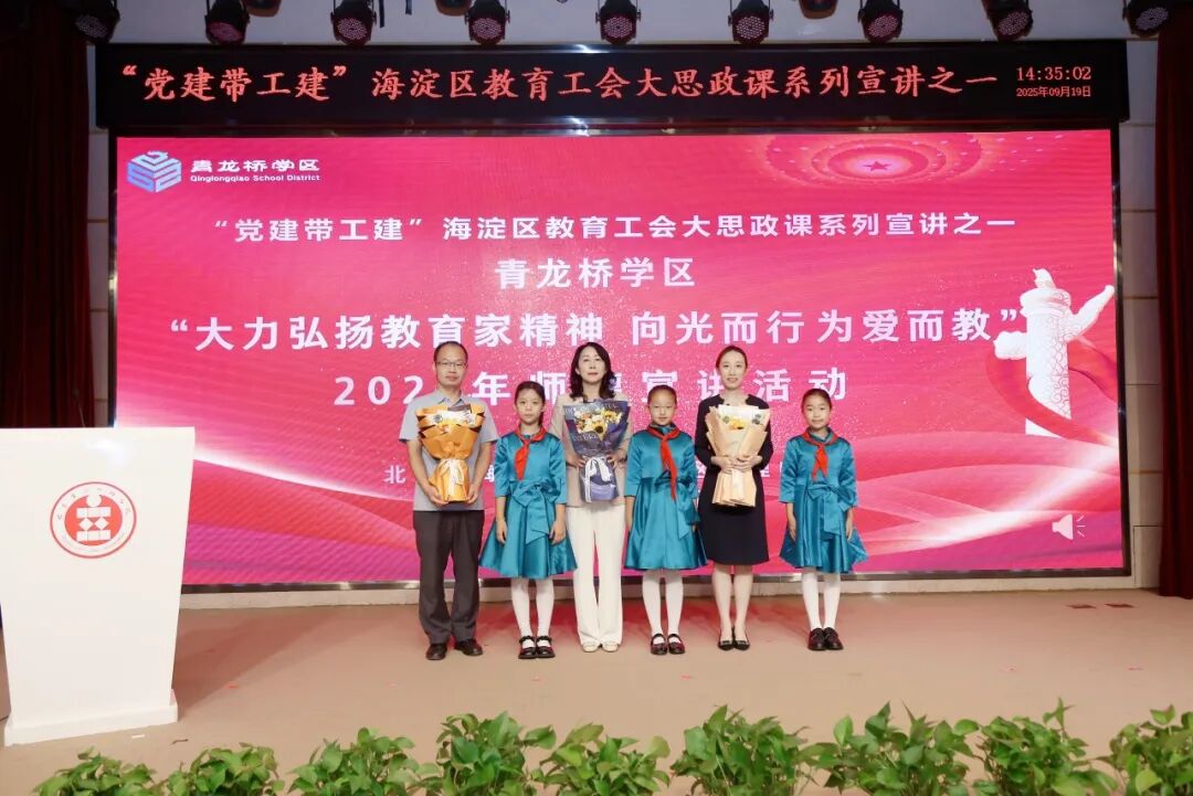 青龙桥学区管理中心书记、主任杨槟发表致辞,介绍了青龙桥学区成立10年来的思政育人历程。她表示,此次活动既是“党建带工建”的有益实践,也让“海淀就是一所大学校”的理念在一线扎根。学区将以教师事迹分享为教育家精神传递赋能,推动大思政教育融入方方面面,努力培育新时代“大先生”。