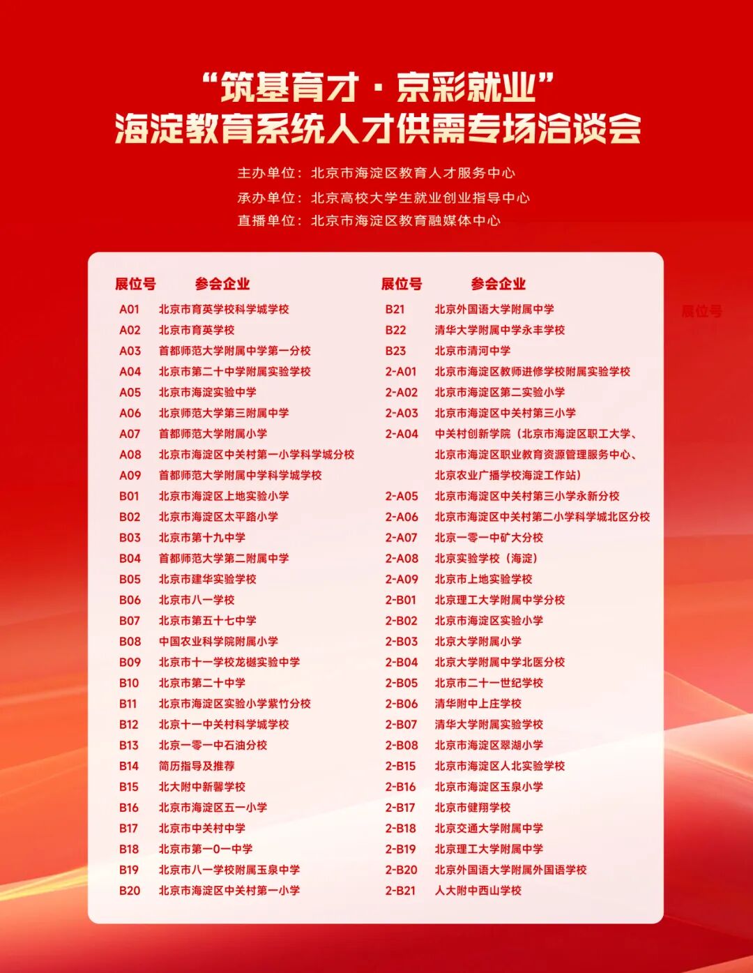 就在后天(9月25日14点),“海淀教育系统专场人才供需洽谈会”在北京高校大学生就业创业指导中心开启,现场共有55家用人单位参与,诚盼广大毕业生朋友共赴这场双向奔赴之约!