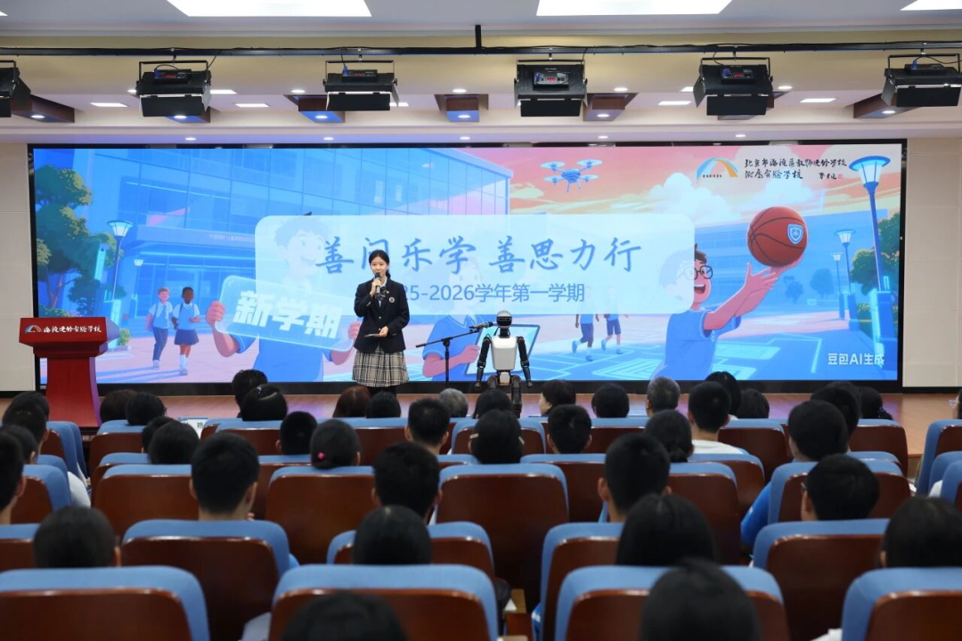 以“善问乐学,善思力行”为主题,学校开启了一场融合家国情怀、科技创新与自主成长的开学第一课。首次亮相的智能机器人“小进”用科技感满满的问候在校门口迎接大家,引起同学们阵阵好奇与欢笑。在与“机械灵巧手”的趣味互动中,同学们感受到科技带来的别样魅力。