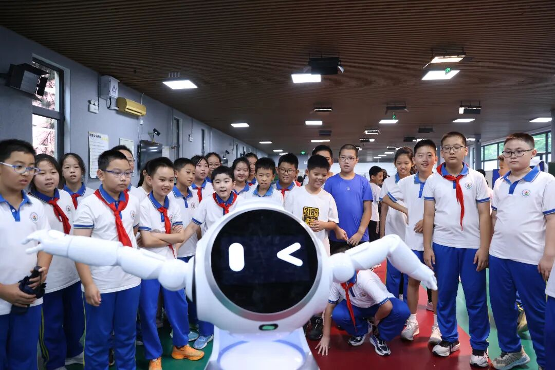 以“智趣童行・未来启航”为主题的人工智能嘉年华在校园火热开启。智慧迎宾机器人Cruzr、具身智能机器人“天工”、智能舞蹈机器人、智能机器狗、格斗机器人、足球机器人、数字人智能对话、AI涂鸦山水等智能项目轮番登场,让孩子们在沉浸式体验中触摸科技温度,种下“强国少年”的科技梦想。从会跳舞的机器人到能对话的数字先贤,从创意无限的AI绘画到充满挑战的人脸识别游戏,同学们充满了对科技的向往和对未来的期待。