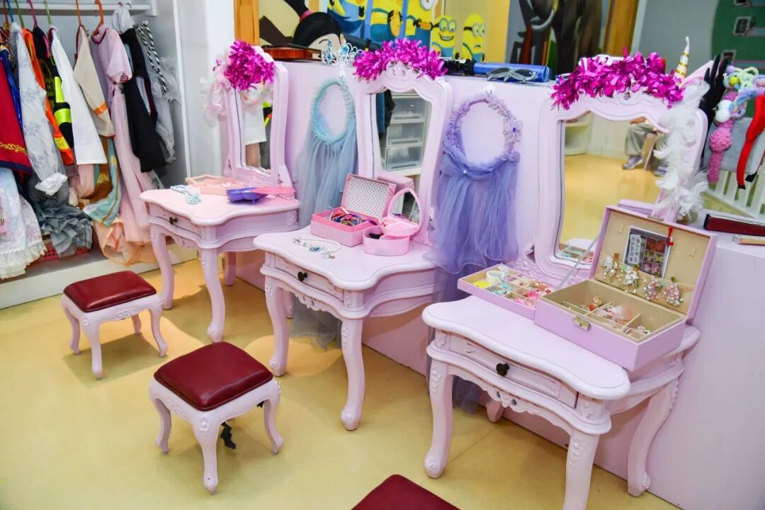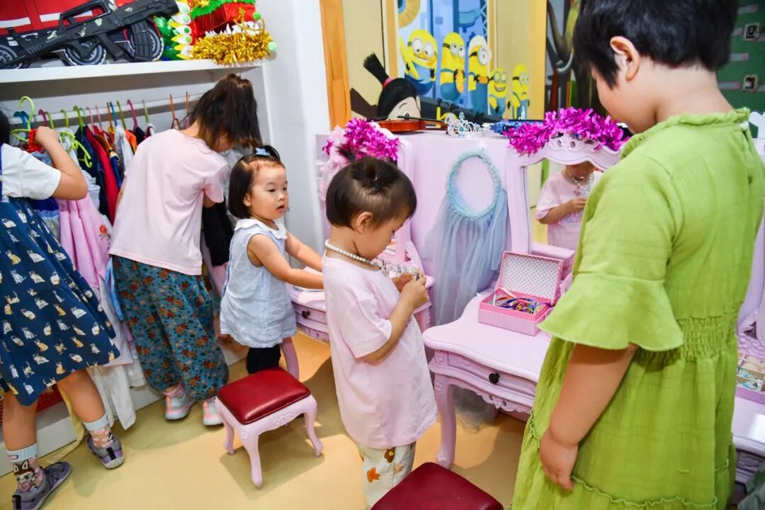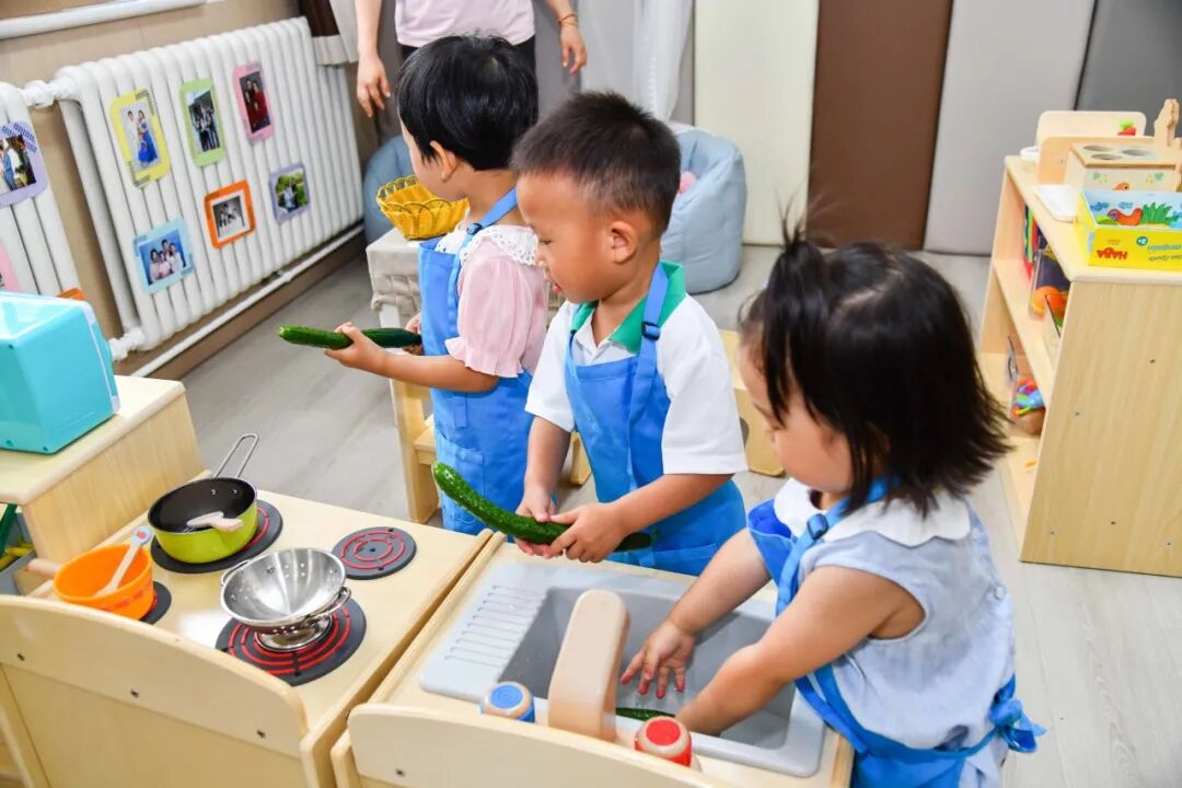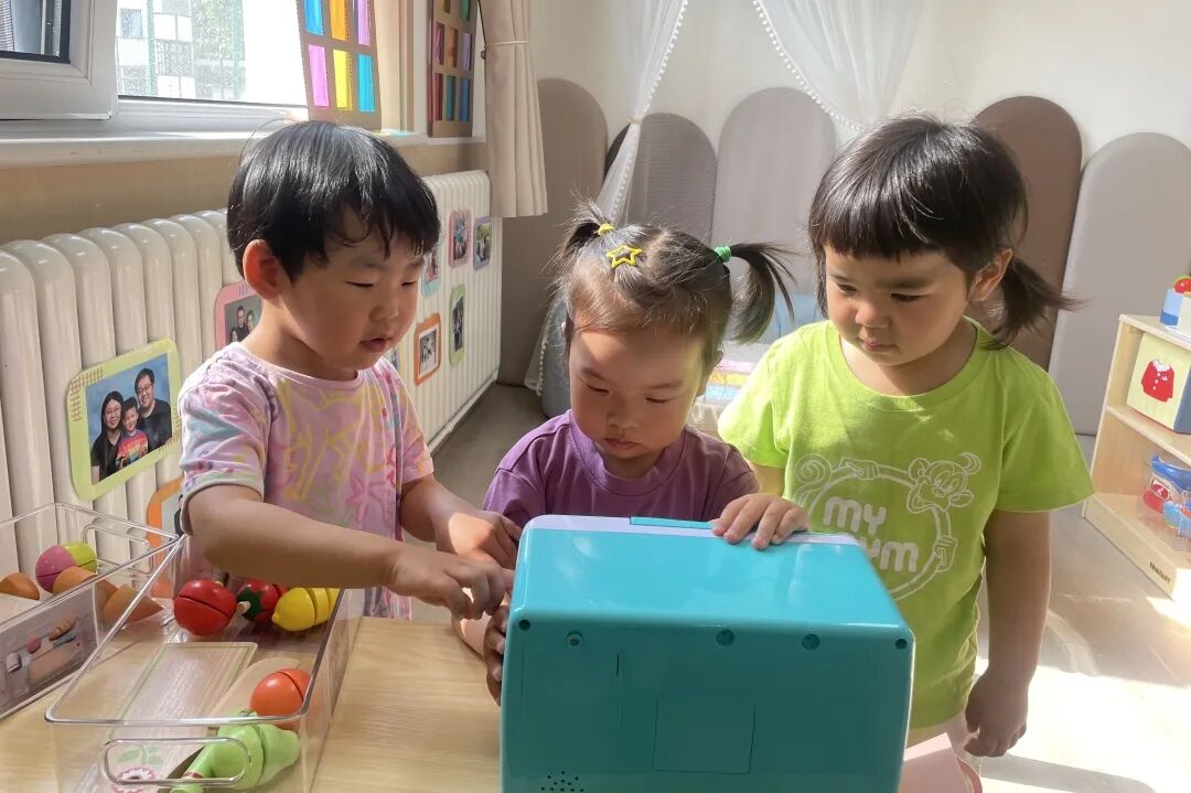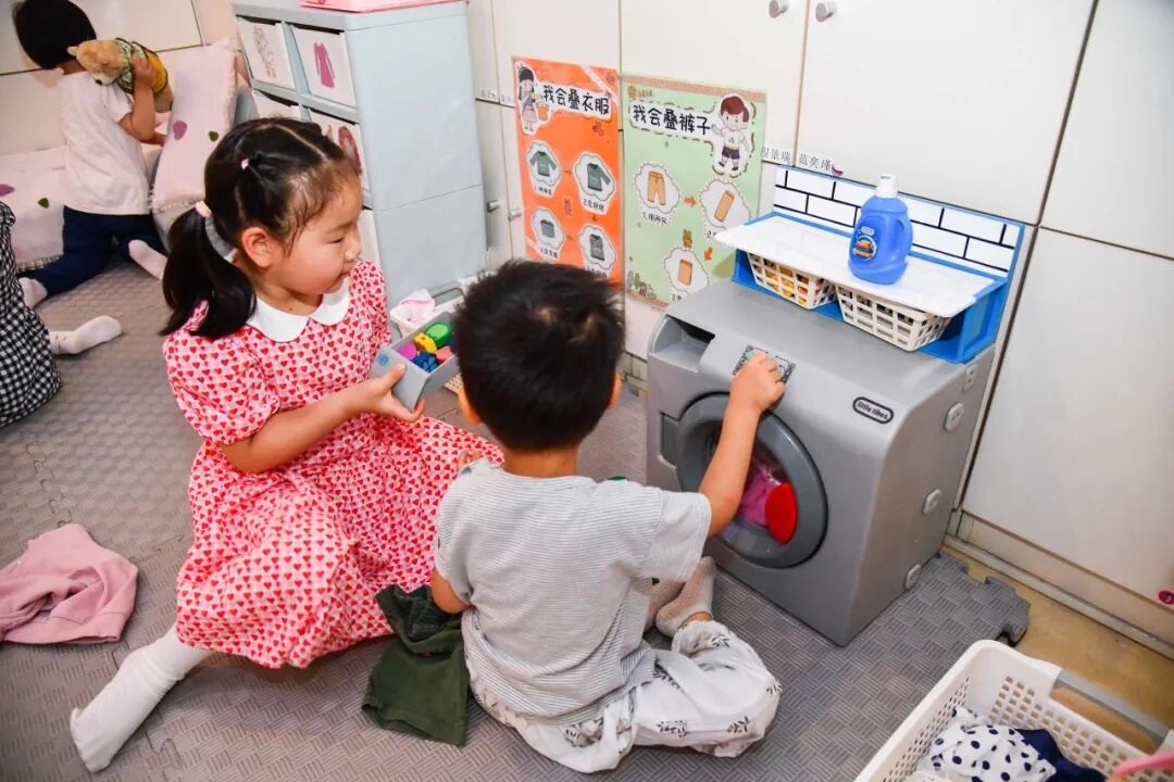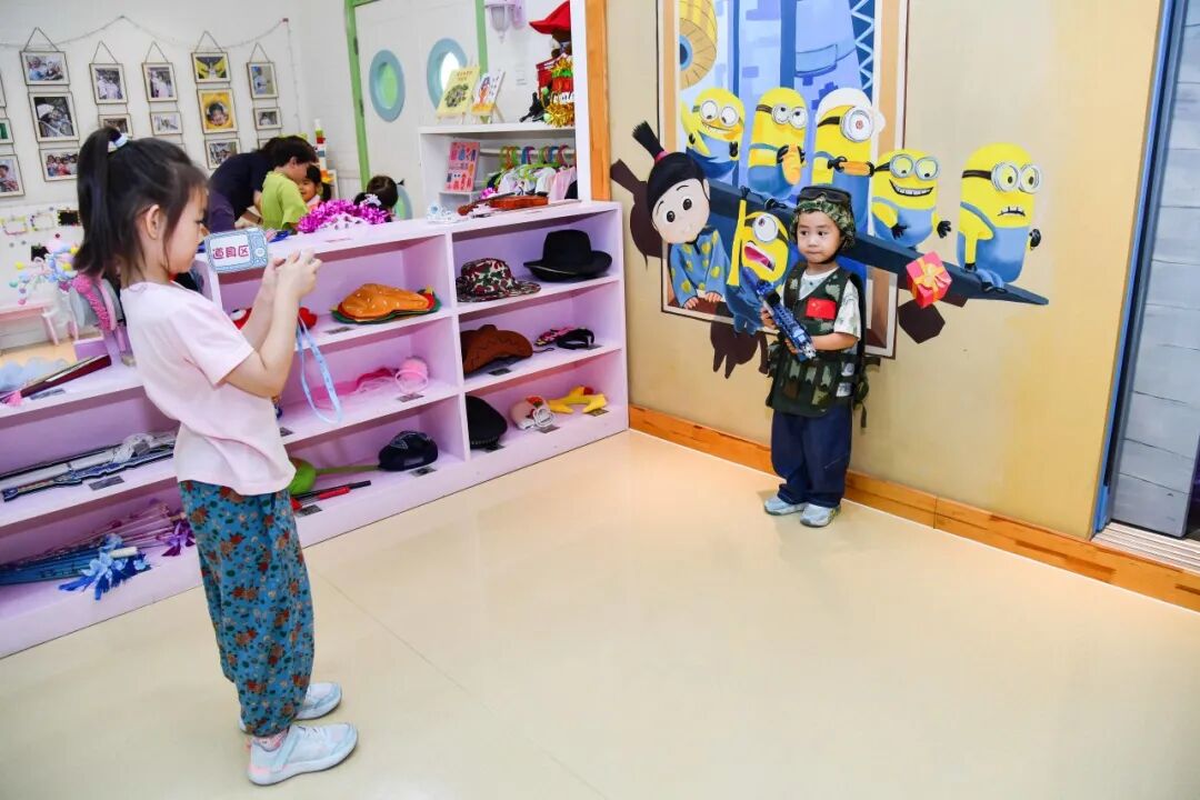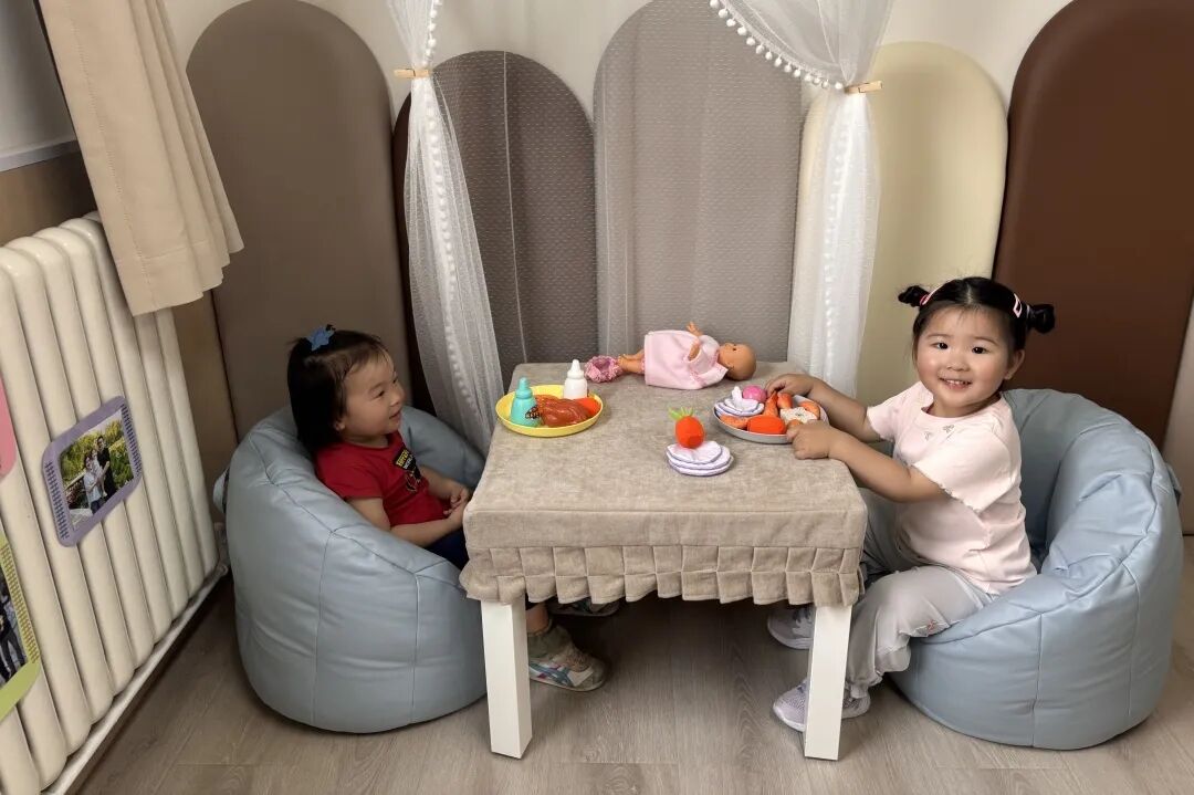 在娃娃家的时候,我们会在墙面上贴上孩子们的全家福,让孩子感觉像在家一样。孩子也可以自己选择扮演一些角色,比如当爸爸、当妈妈。娃娃家里还有小宝宝的玩偶,孩子可以照顾宝宝。