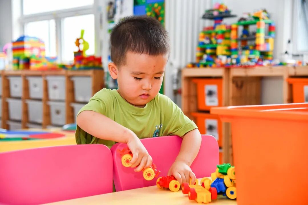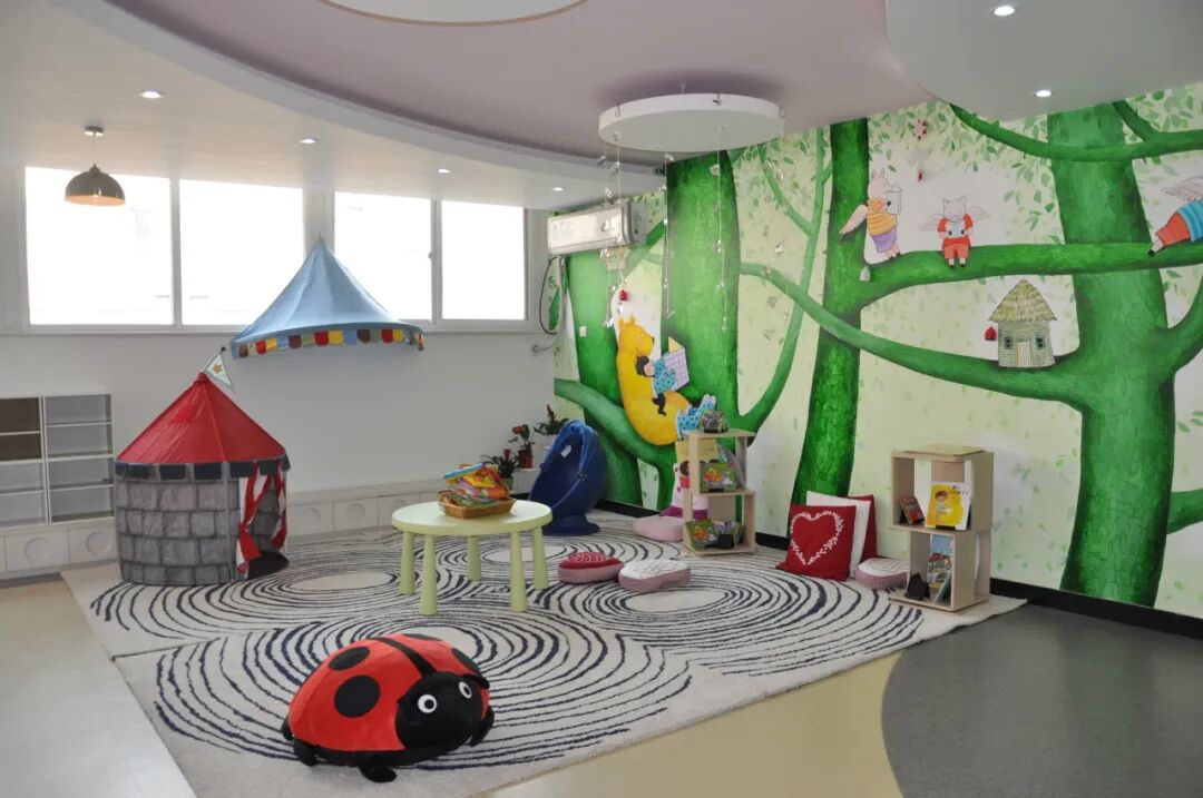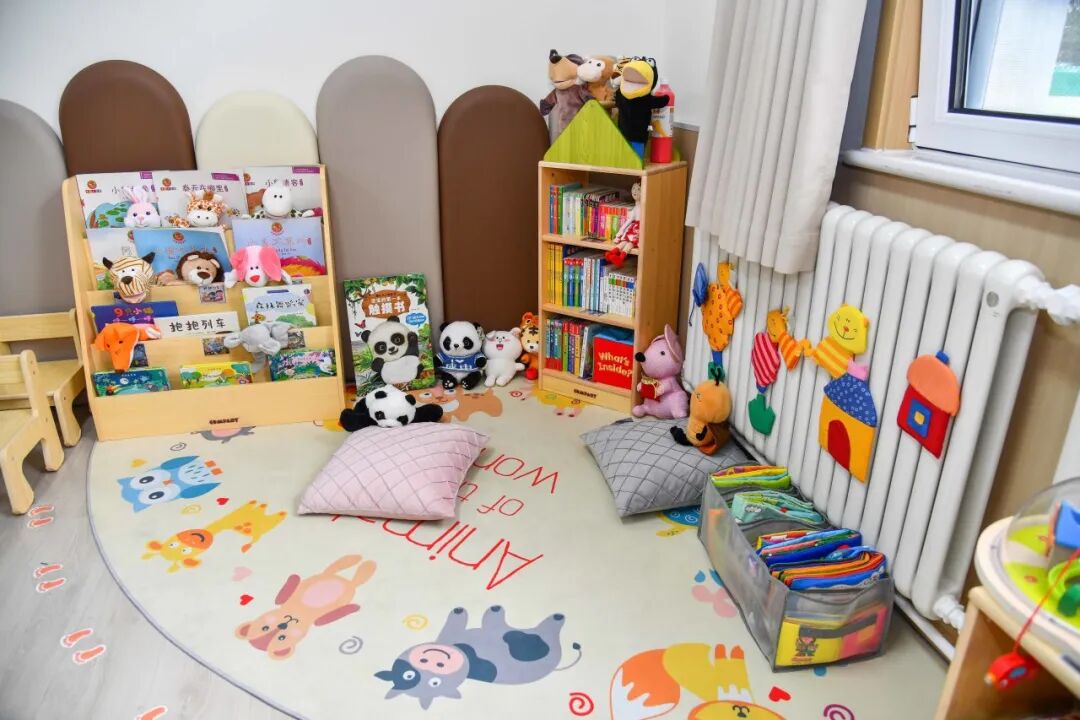 教室以温暖的米色为主色调,图书区、娃娃家、益智区、建构区等区域支持幼儿充分游戏。区域采用动态调整原则,随时调整空间大小,活动材料也符合托班年龄特点,并且随时更替,定期消毒。此外,托班充分利用墙面空间,如乐高墙、涂鸦墙,支持托班幼儿自主游戏。