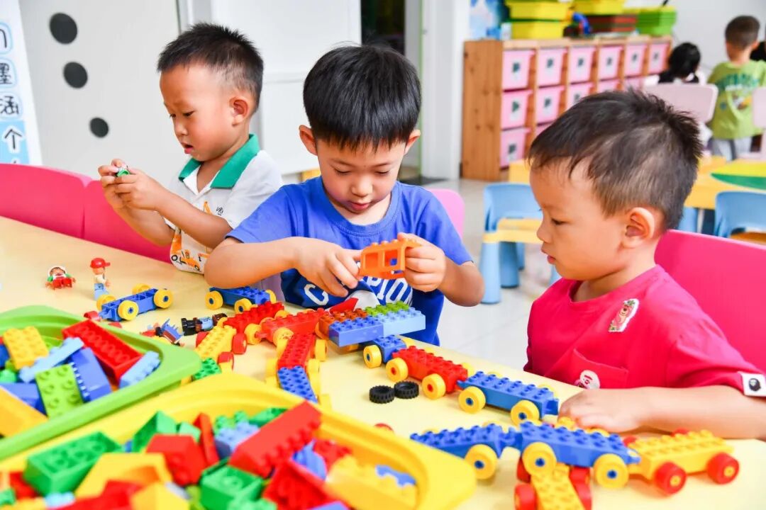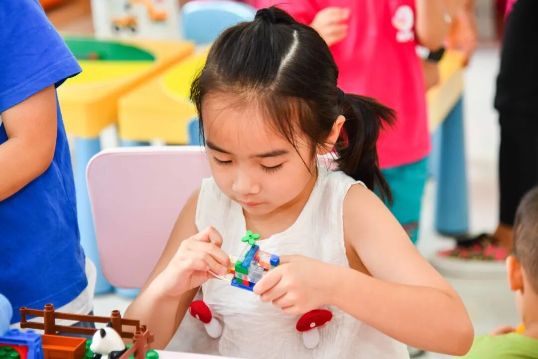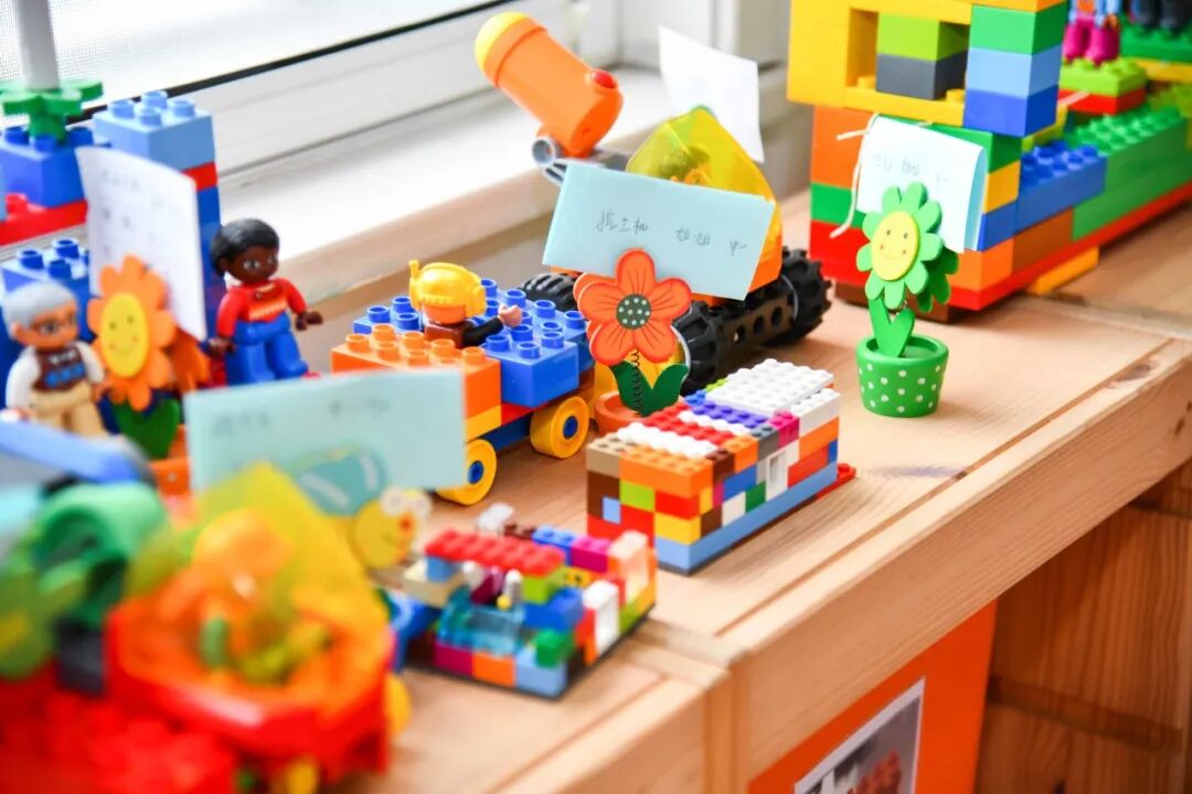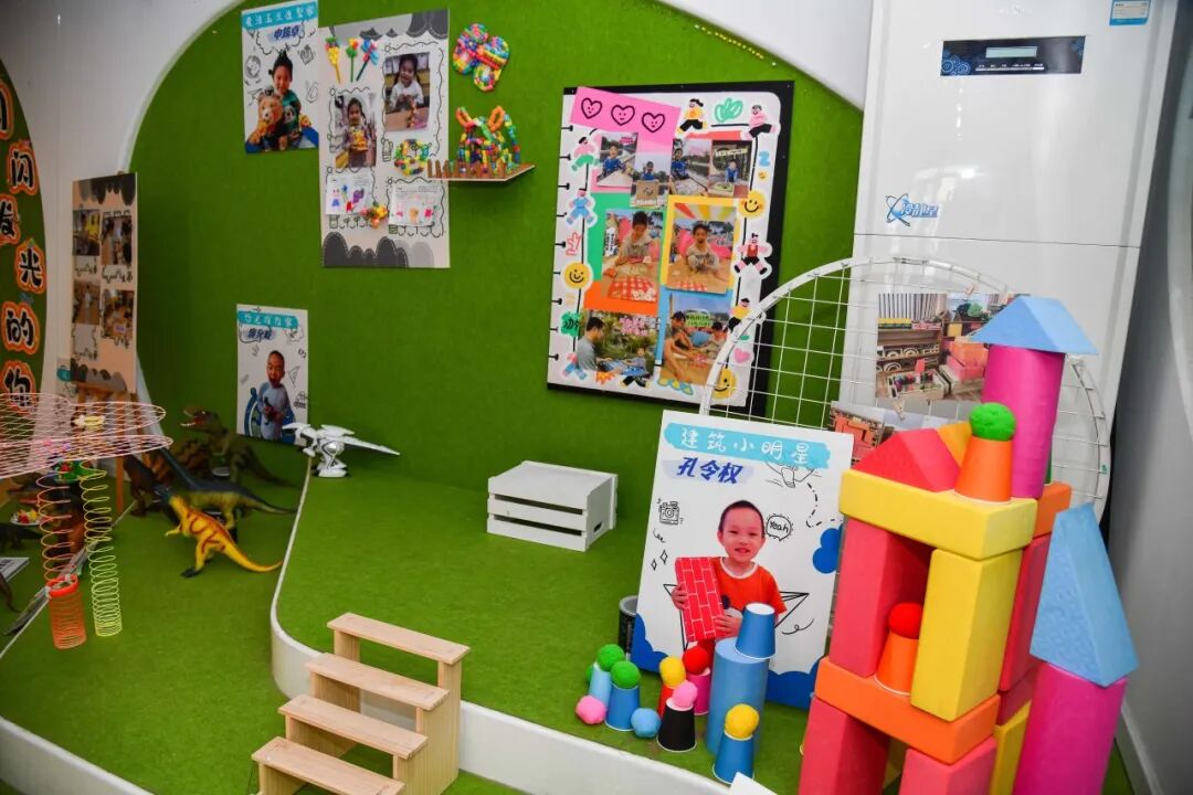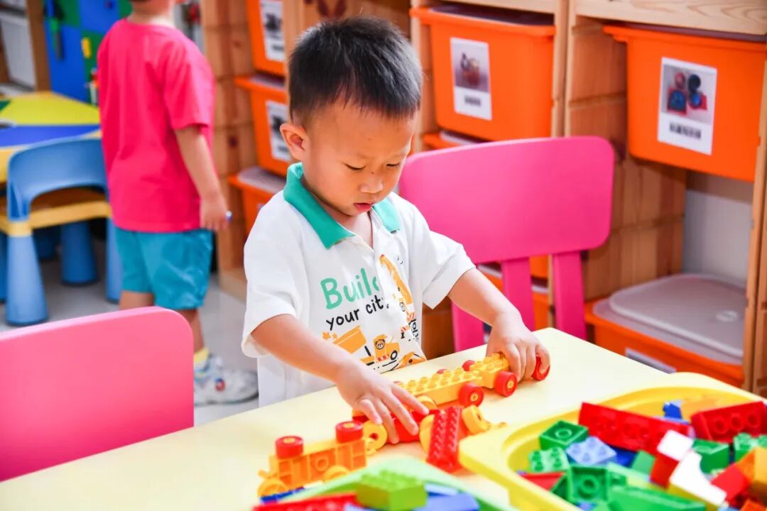 建构区,孩子们可以用乐高墙、拼插玩具、磁力小积木进行空间上的搭建,建立他们初步的空间构造能力。