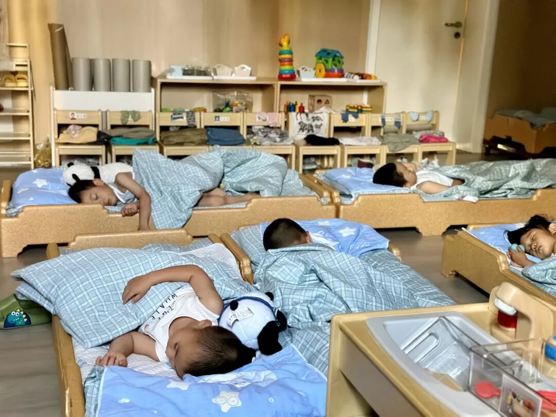 12:00-14:30,是孩子们的午睡时间,伴随着轻柔的音乐,孩子们躺在小床上,教室里逐渐安静下来,孩子们进入甜甜的梦乡,老师们不时地巡视轻轻为他们盖好被子,关注着每一个宝贝的情况。