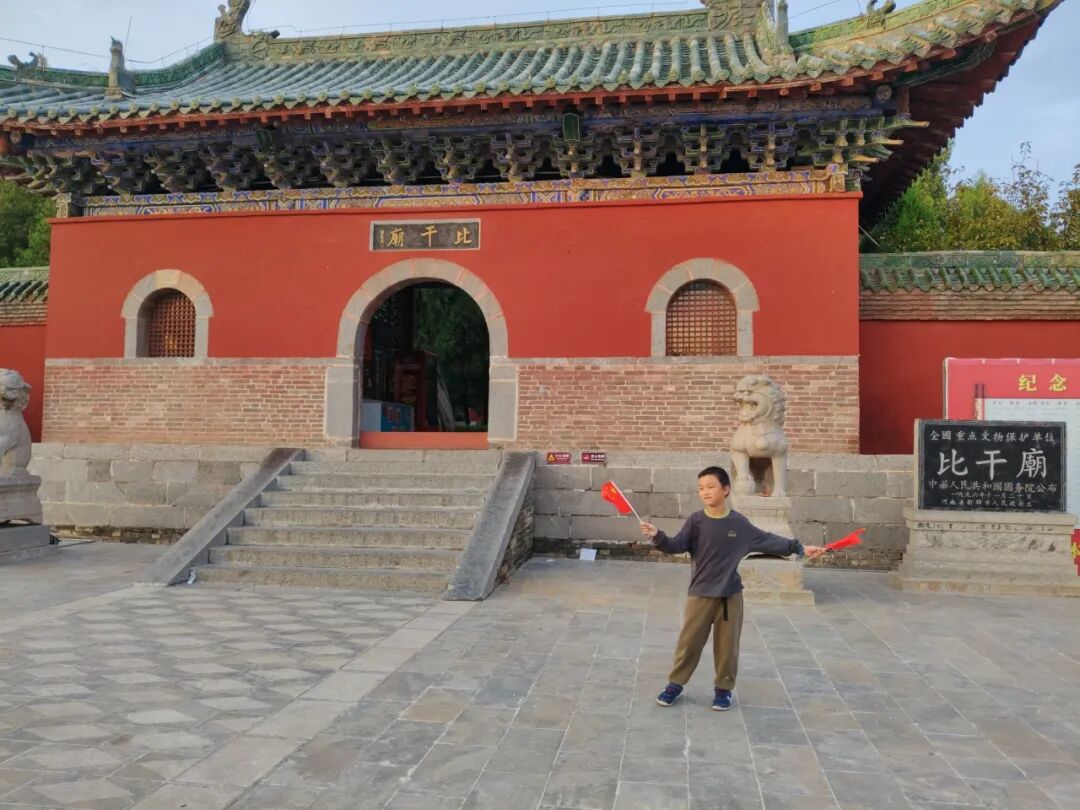 国庆节假期里,爸爸妈妈和姥姥姥爷带我去比干庙游玩。庙里有很多老柏树,其中有几棵奇怪的柏树,姥爷说它叫“开心柏”,传说比干的心被坏人挖走了,这几棵大树就想把自己的心送给他。姥爷告诉我,比干是古代的大忠臣,他非常爱自己的国家。为了救国家,他连自己的生命都不怕牺牲。我心里想:“我也要向比干学习,用实际行动爱我们的祖国。”
