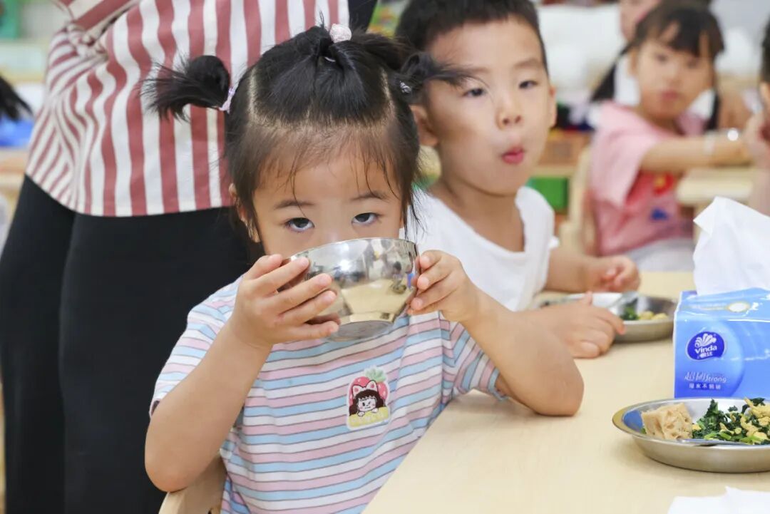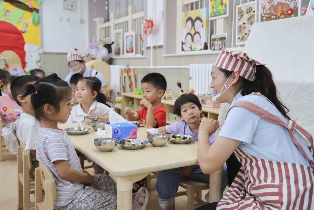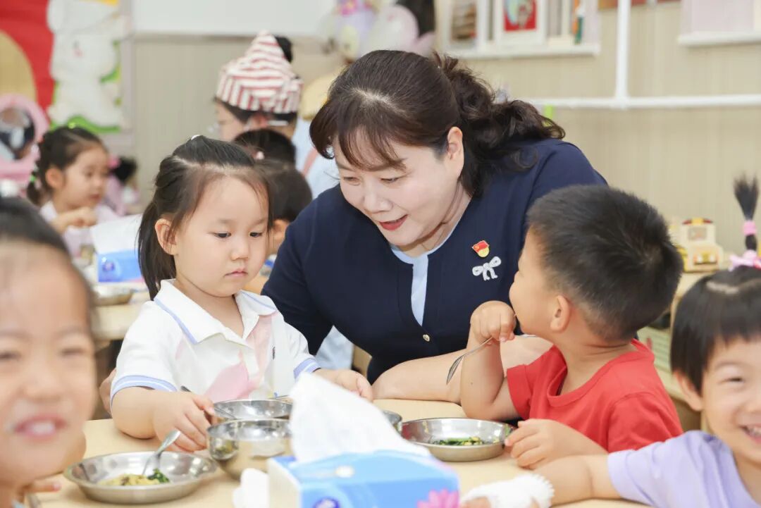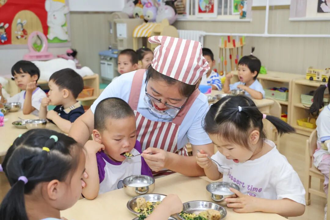 在现场,大家看到孩子们在教师的照护下开心的进餐。每个小朋友都吃的非常认真、美味,教师们则在一旁时刻注意着每个孩子的举动,确保孩子们的用餐安全。餐食结束后,小朋友们在教师的带领下,有序地开展游戏活动,他们玩得超开心。