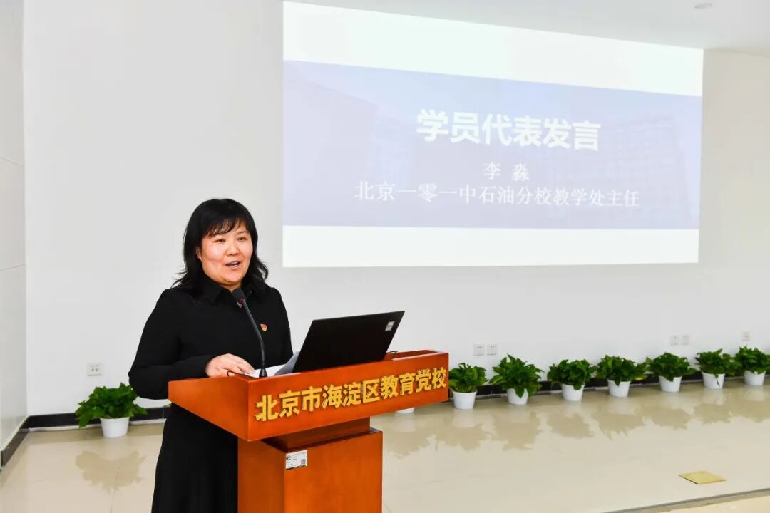 北京一零一中石油分校教学处主任李淼作为学员代表发言。她以“百战归来再读书”诠释学习初心,以“重整行装再出发”表达奋进决心,承诺将珍惜培训机会,锤炼党性修养,提升能力素质,以实际行动服务区域教育发展。