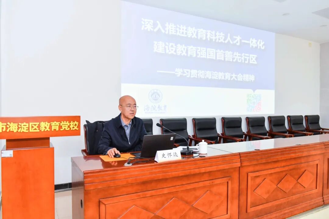 史怀远以《深入推进教育科技人才一体化 建设教育强国首善先行区——学习贯彻海淀教育大会精神》为全体学员讲授了“开班第一课”。课程系统解读了海淀区教育大会的部署要求与改革任务,为接下来三个月的集中培训奠定了坚实的思想基础。