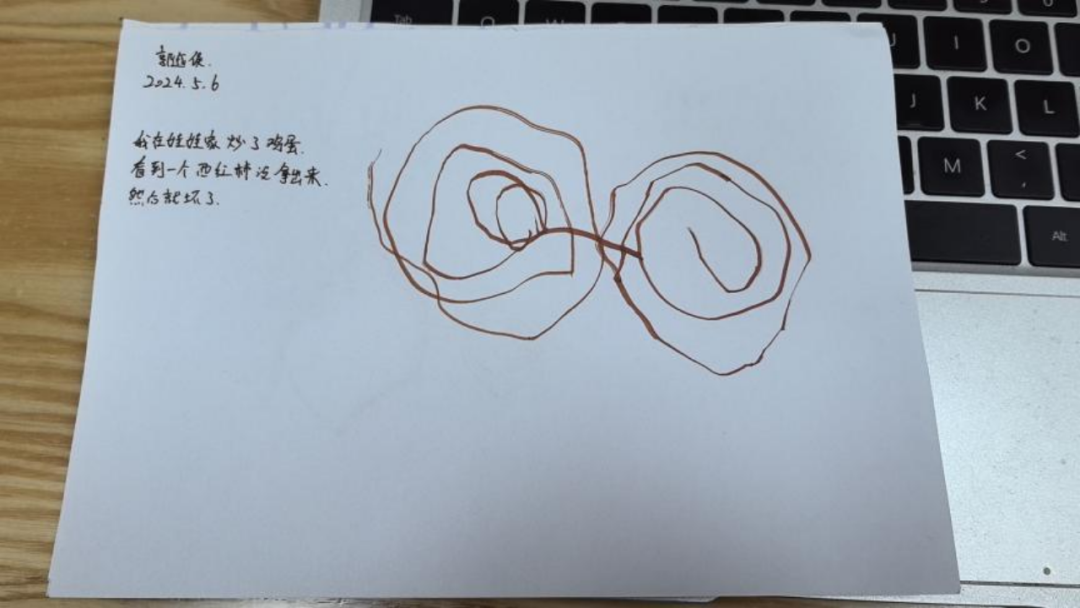 在接下来的观察中,我还发现他十分喜欢旋转的东西,绘画的方式也是螺旋形的。例如,他在娃娃家中炒了鸡蛋和西红柿。在他表征中那两个圆圆的连起来像眼镜一样的东西,一个是摊出来的圆圆的鸡蛋,一个是圆圆的西红柿。我问他为什么西红柿上有很多圆圆的线呢?他回答我道:“我是这样炒的。”他一边说着一边小手比划着在锅里翻炒的动作。